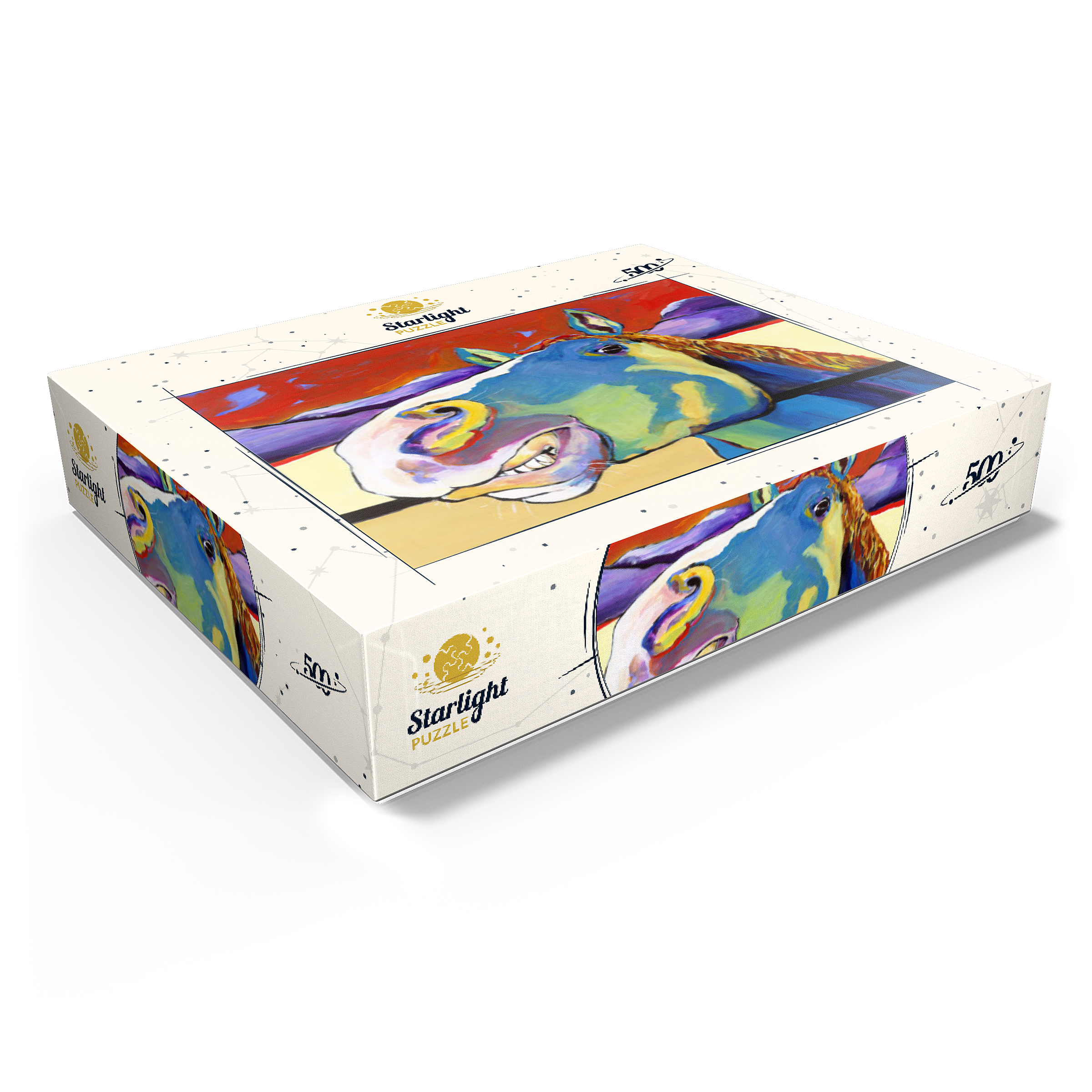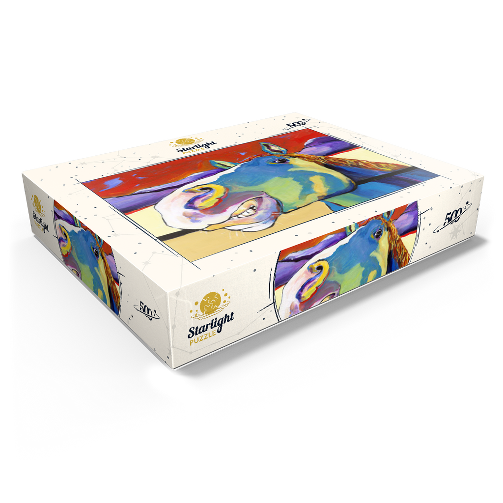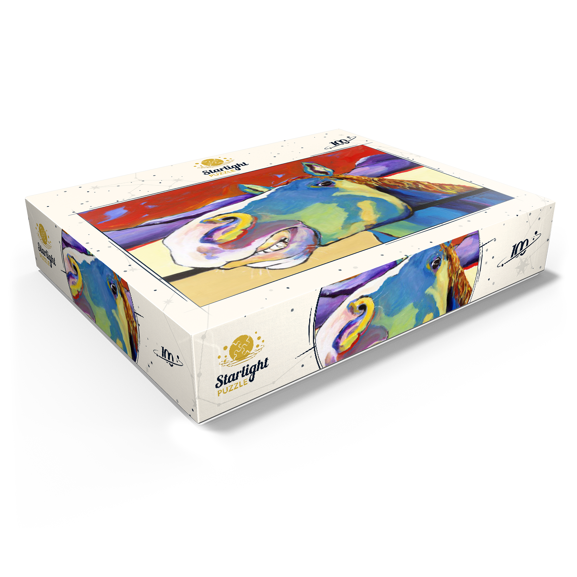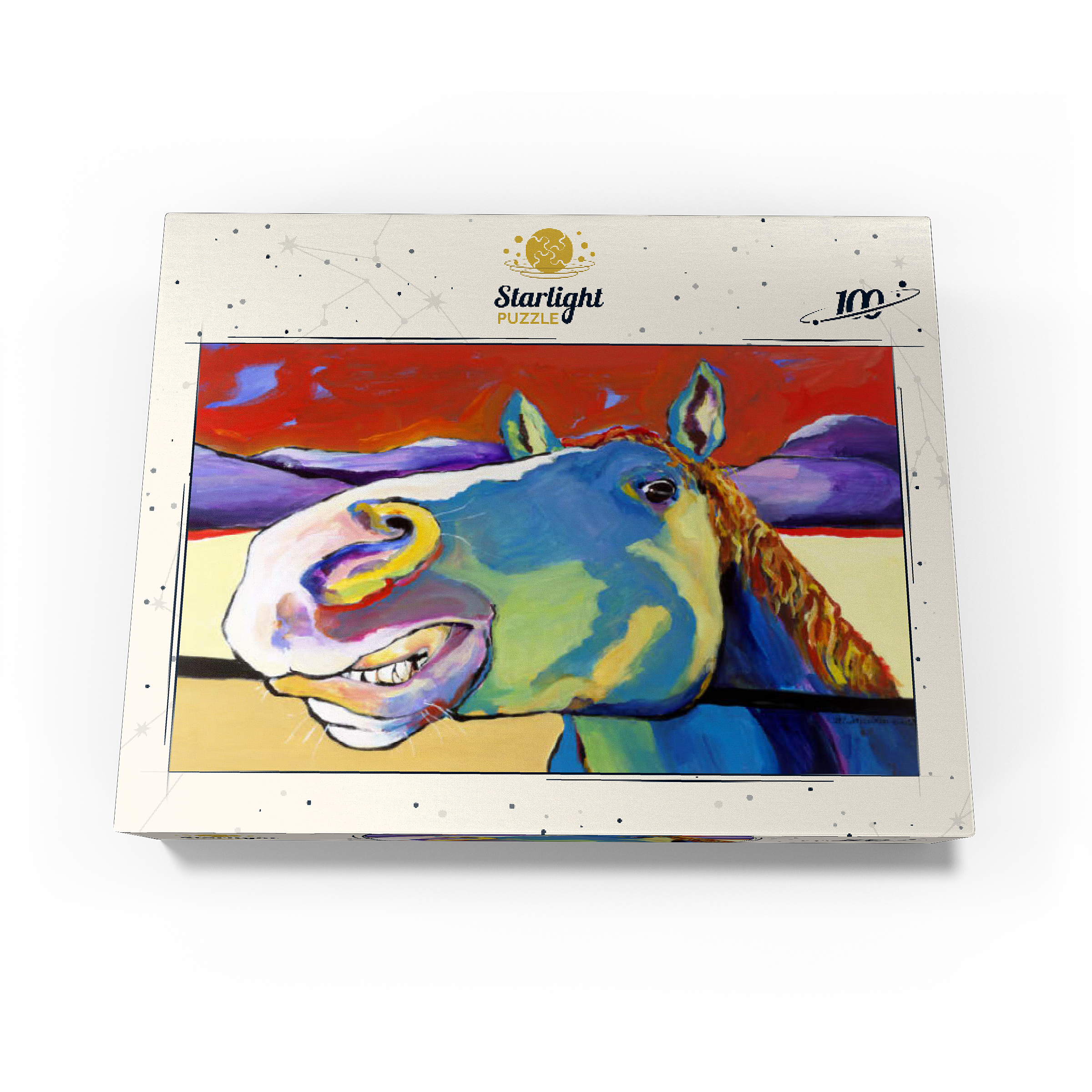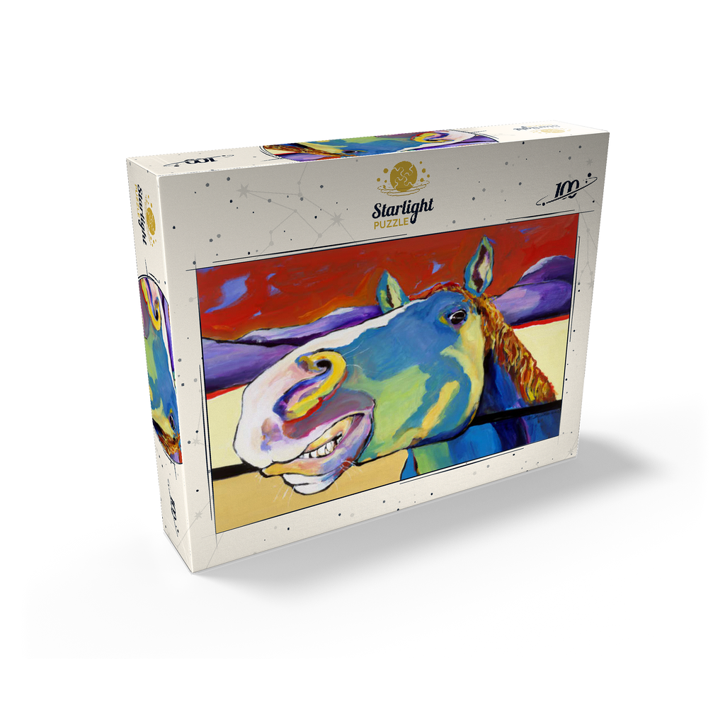 This striking painting showcases a playful and colorful depiction of a horse, brimming with personality and humor. Bold blues, greens, and yellows dominate the composition, set against a vivid red and purple background that emphasizes the horse's lively expression and cheerful grin. The stylized brushstrokes and bright palette give this artwork a modern, whimsical charm, making it a captivating piece for animal and art lovers alike.
