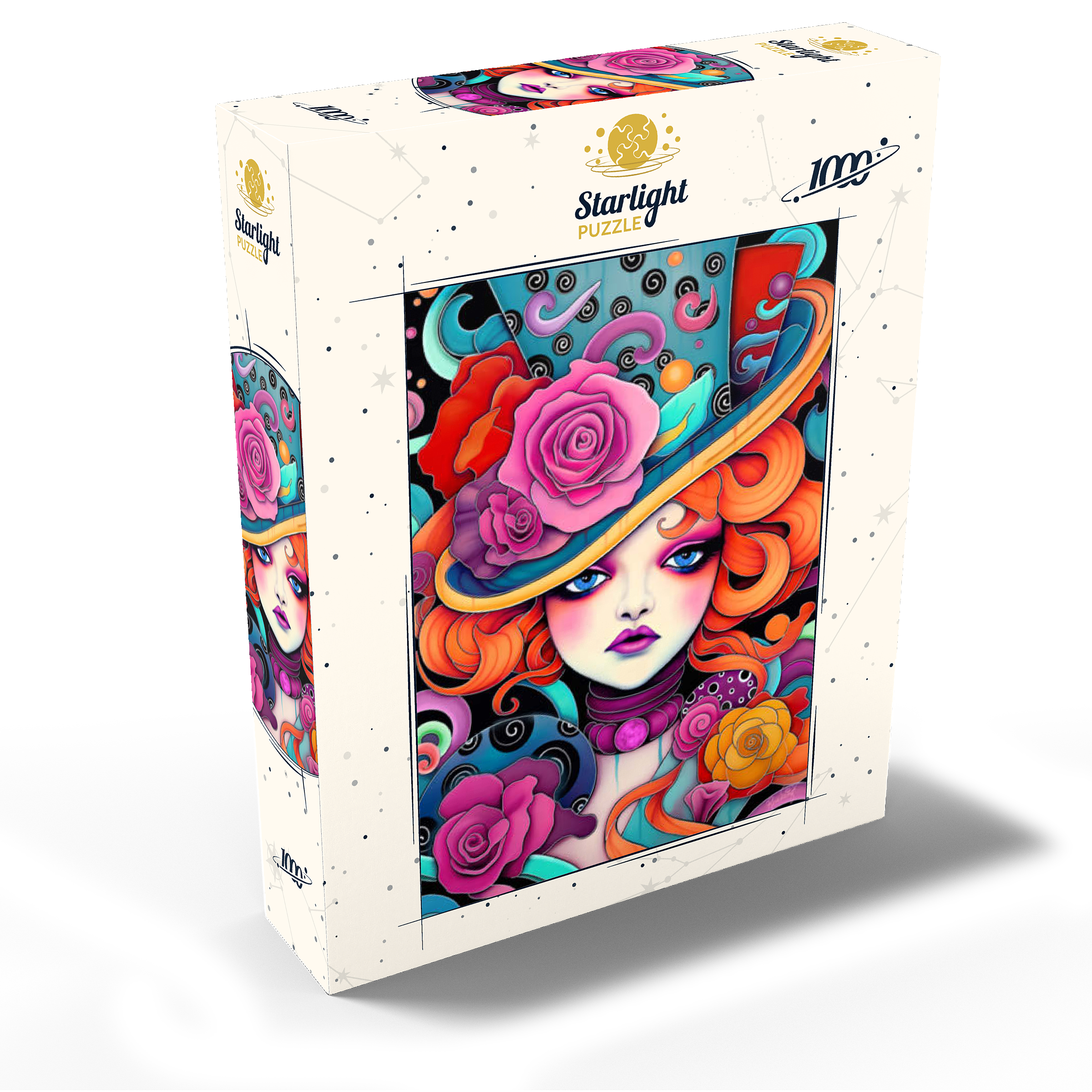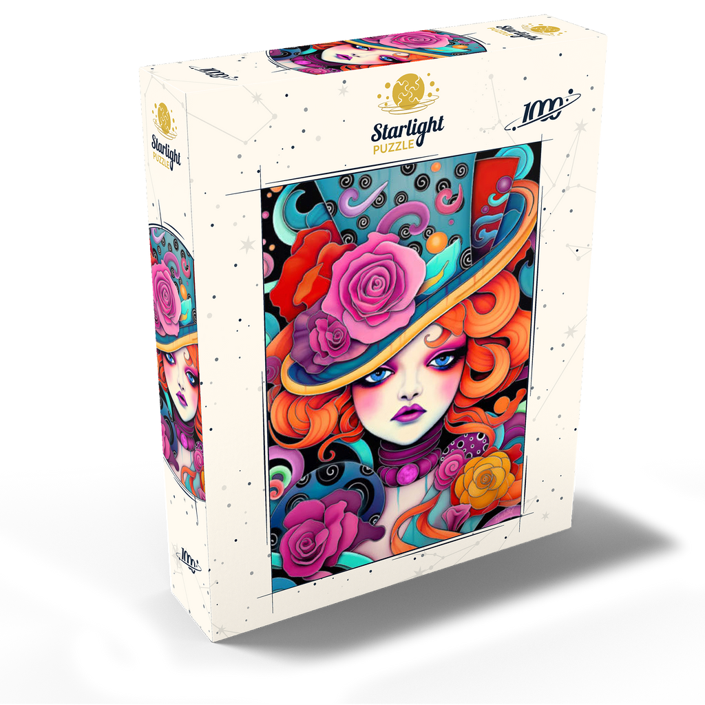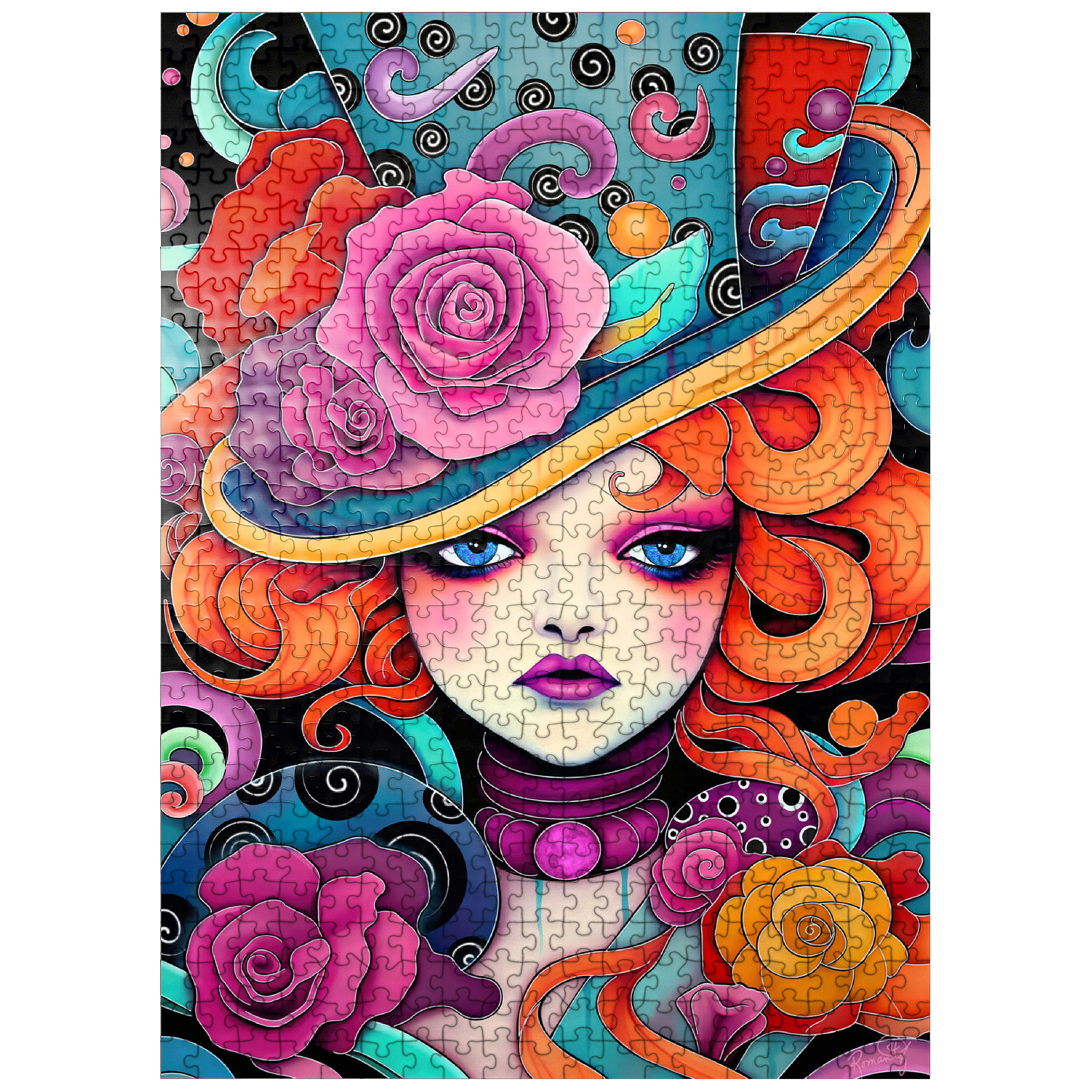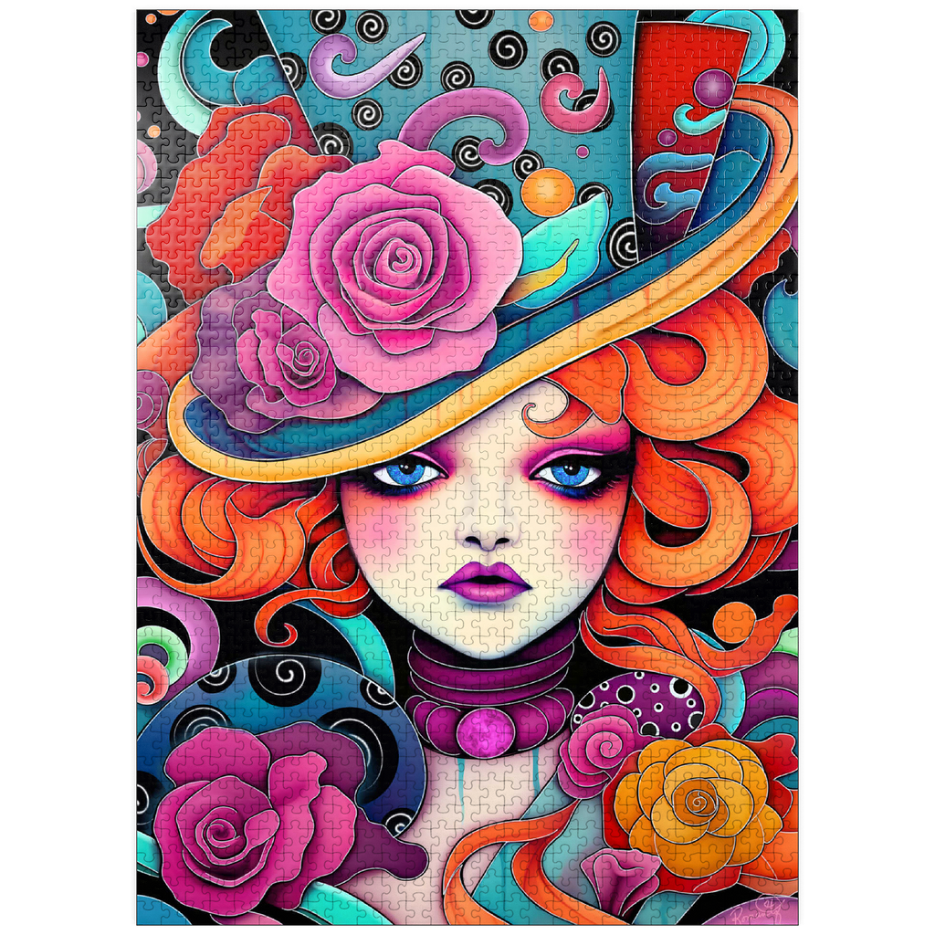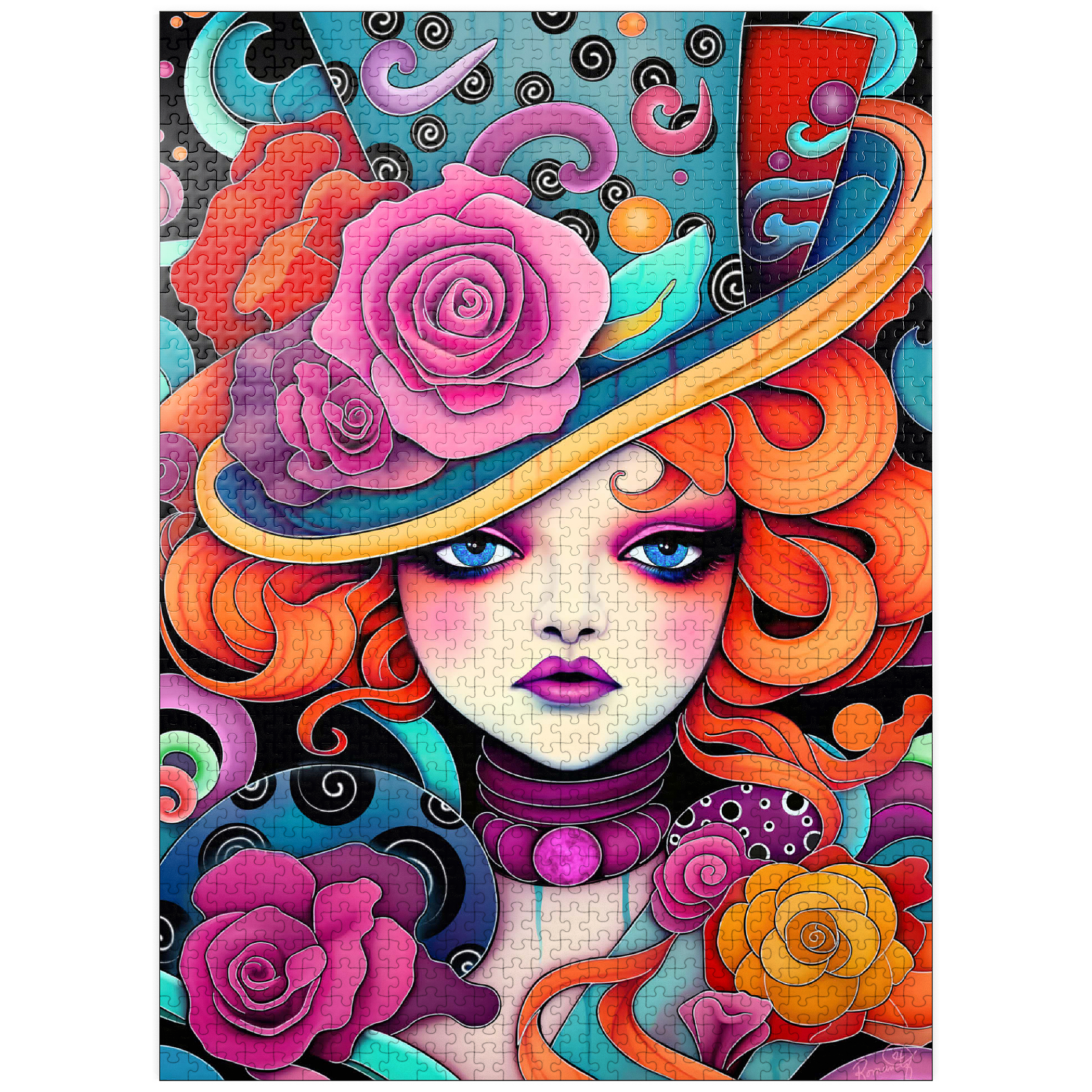 A stunning digital fantasy portrait of a red-haired woman with vivid blue eyes, wearing a tall, surreal hat adorned with vibrant roses and whimsical swirling patterns. her porcelain-like complexion contrasts with the bold, saturated colors of her outfit and background, featuring pinks, purples, teals, and oranges. the floral and abstract elements blend harmoniously, creating a dreamy, Art Nouveau-inspired aesthetic. this imaginative artwork radiates a blend of elegance, mystery, and eccentric charm, perfect for lovers of bold, artistic expressions.