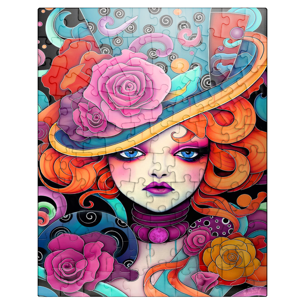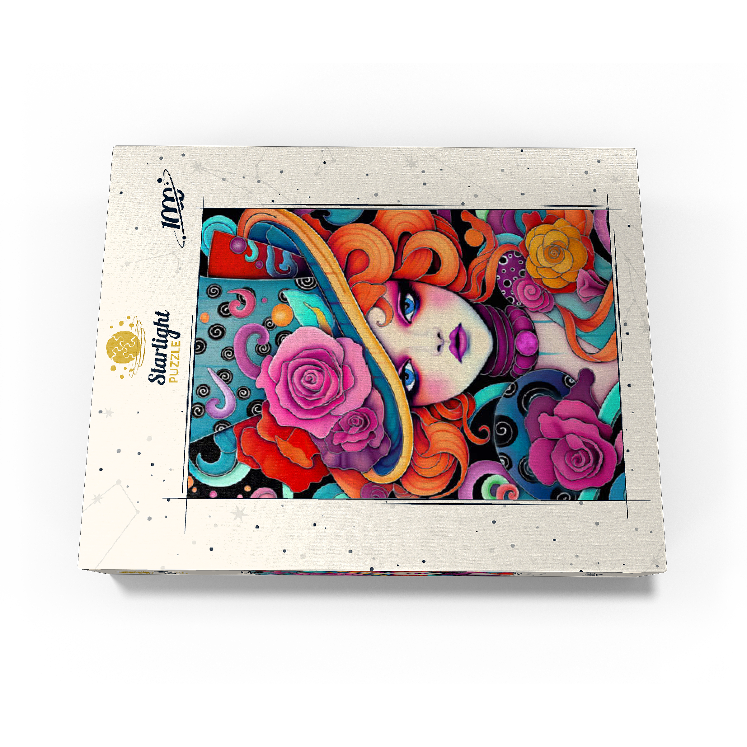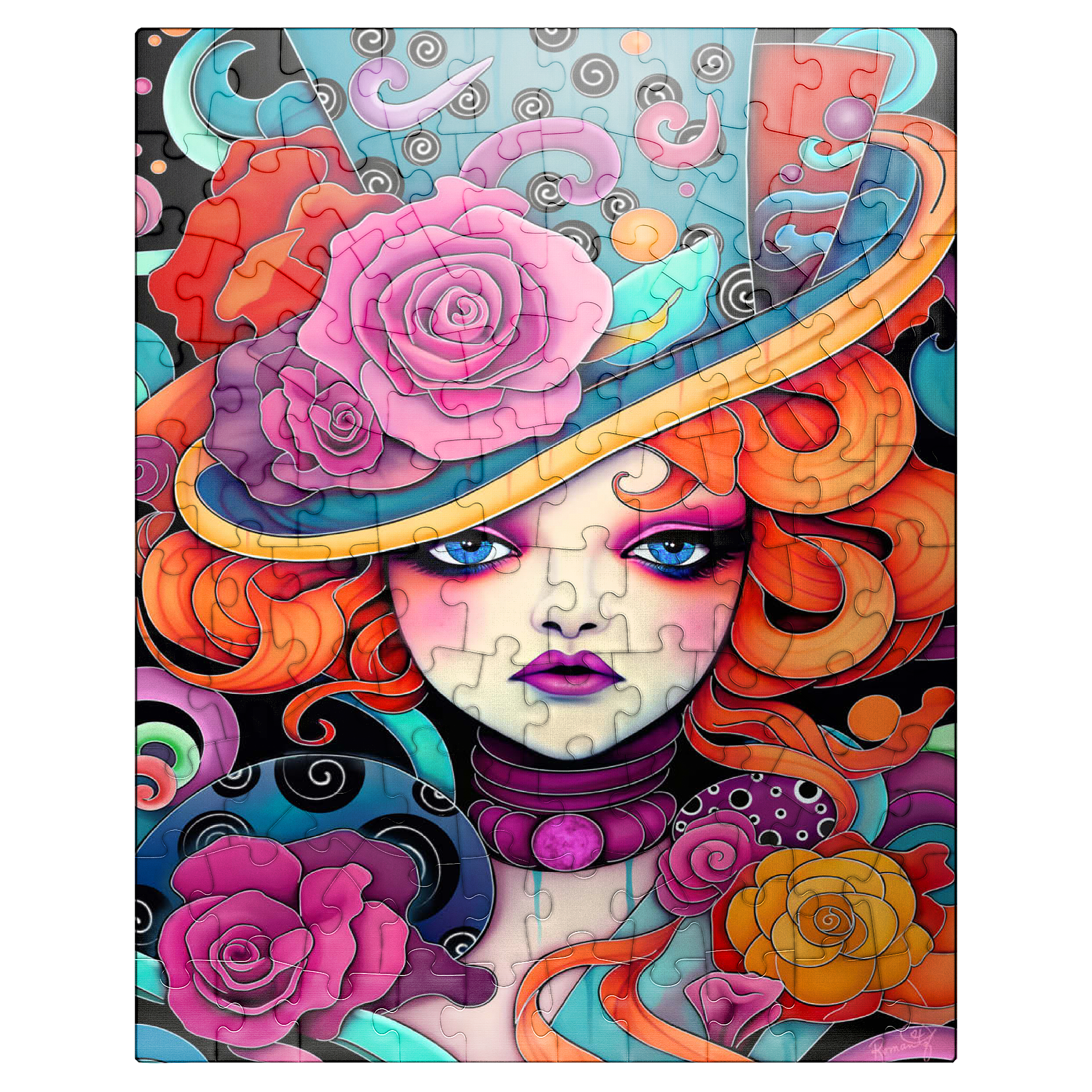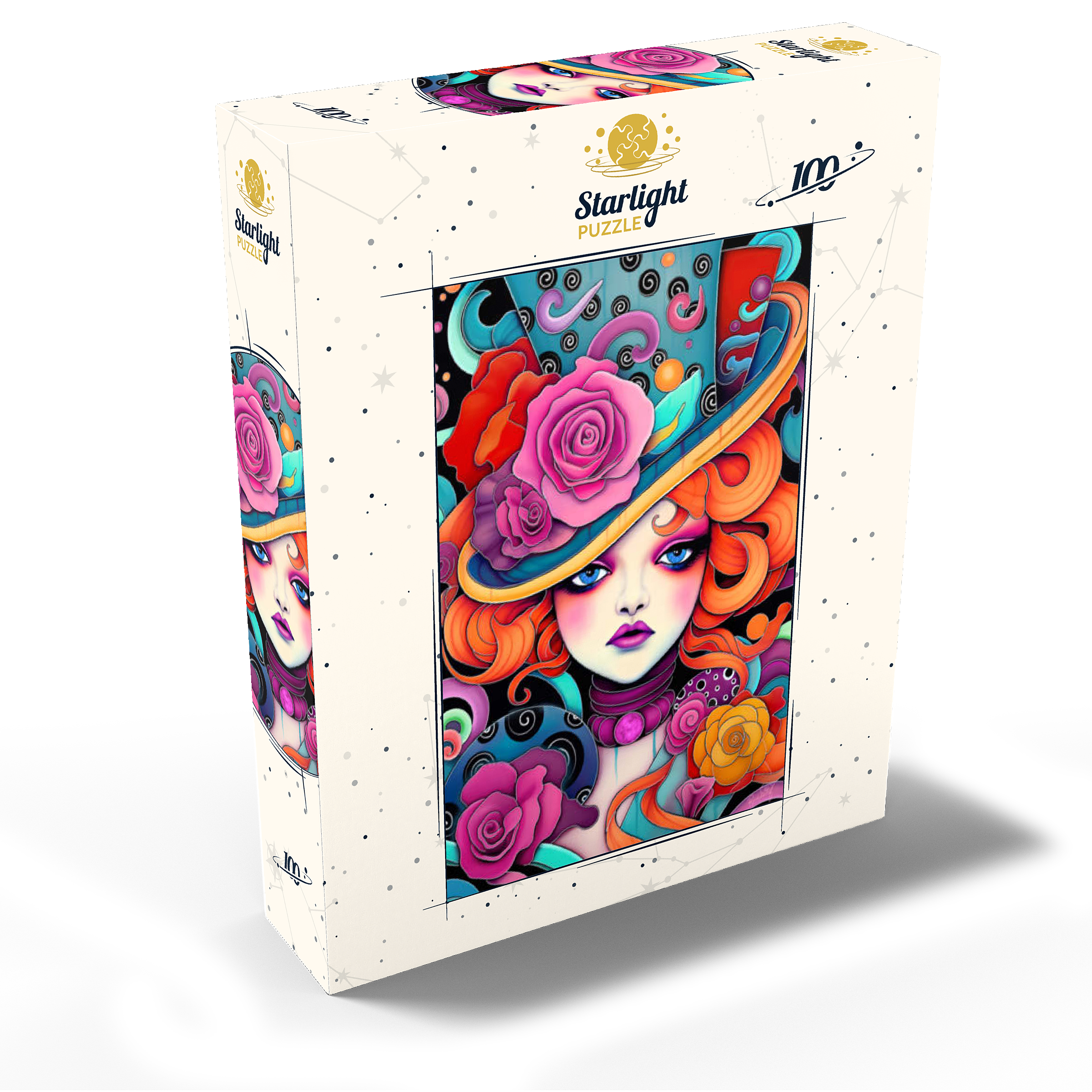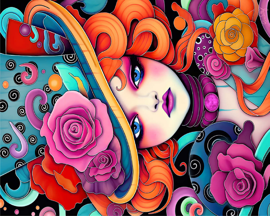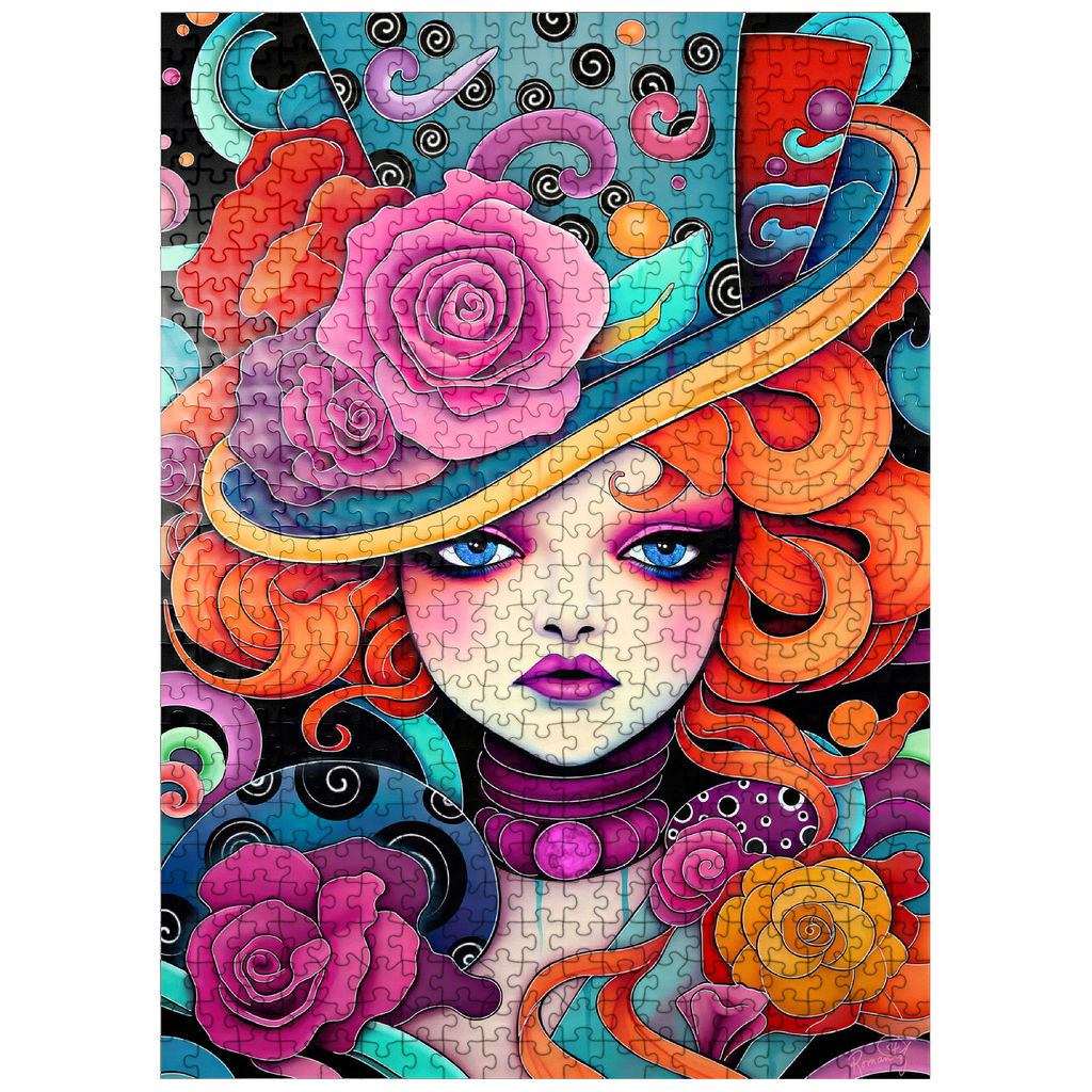 A stunning digital fantasy portrait of a red-haired woman with vivid blue eyes, wearing a tall, surreal hat adorned with vibrant roses and whimsical swirling patterns. her porcelain-like complexion contrasts with the bold, saturated colors of her outfit and background, featuring pinks, purples, teals, and oranges. the floral and abstract elements blend harmoniously, creating a dreamy, Art Nouveau-inspired aesthetic. this imaginative artwork radiates a blend of elegance, mystery, and eccentric charm, perfect for lovers of bold, artistic expressions.