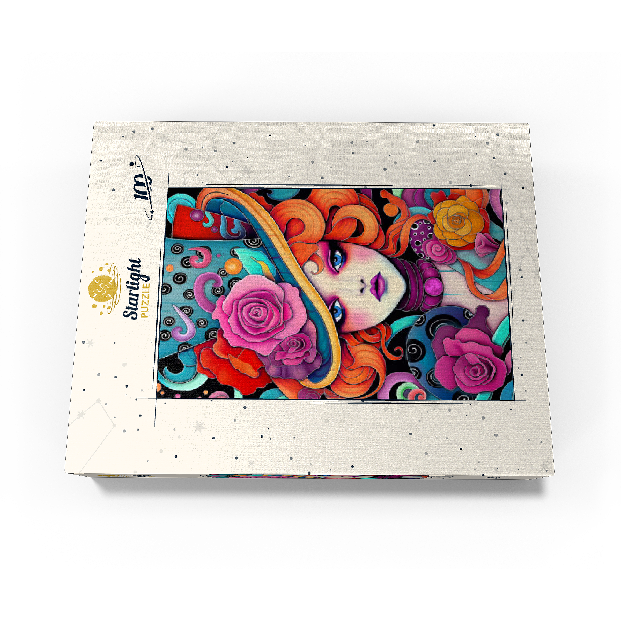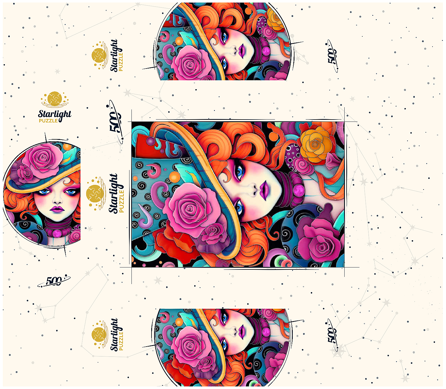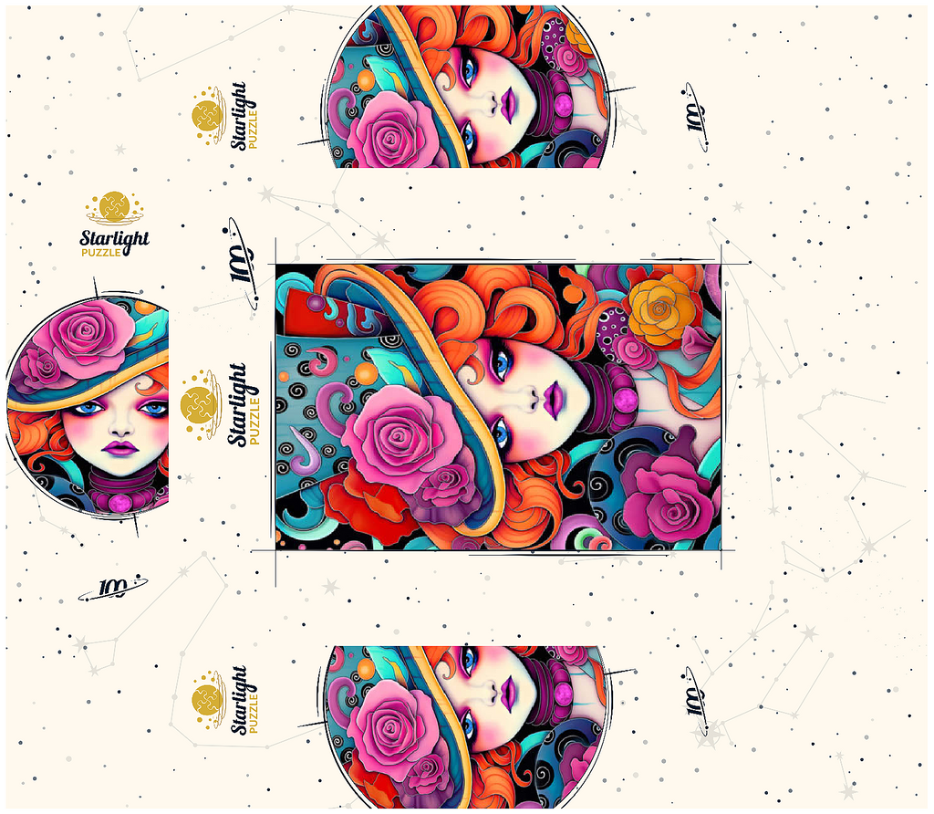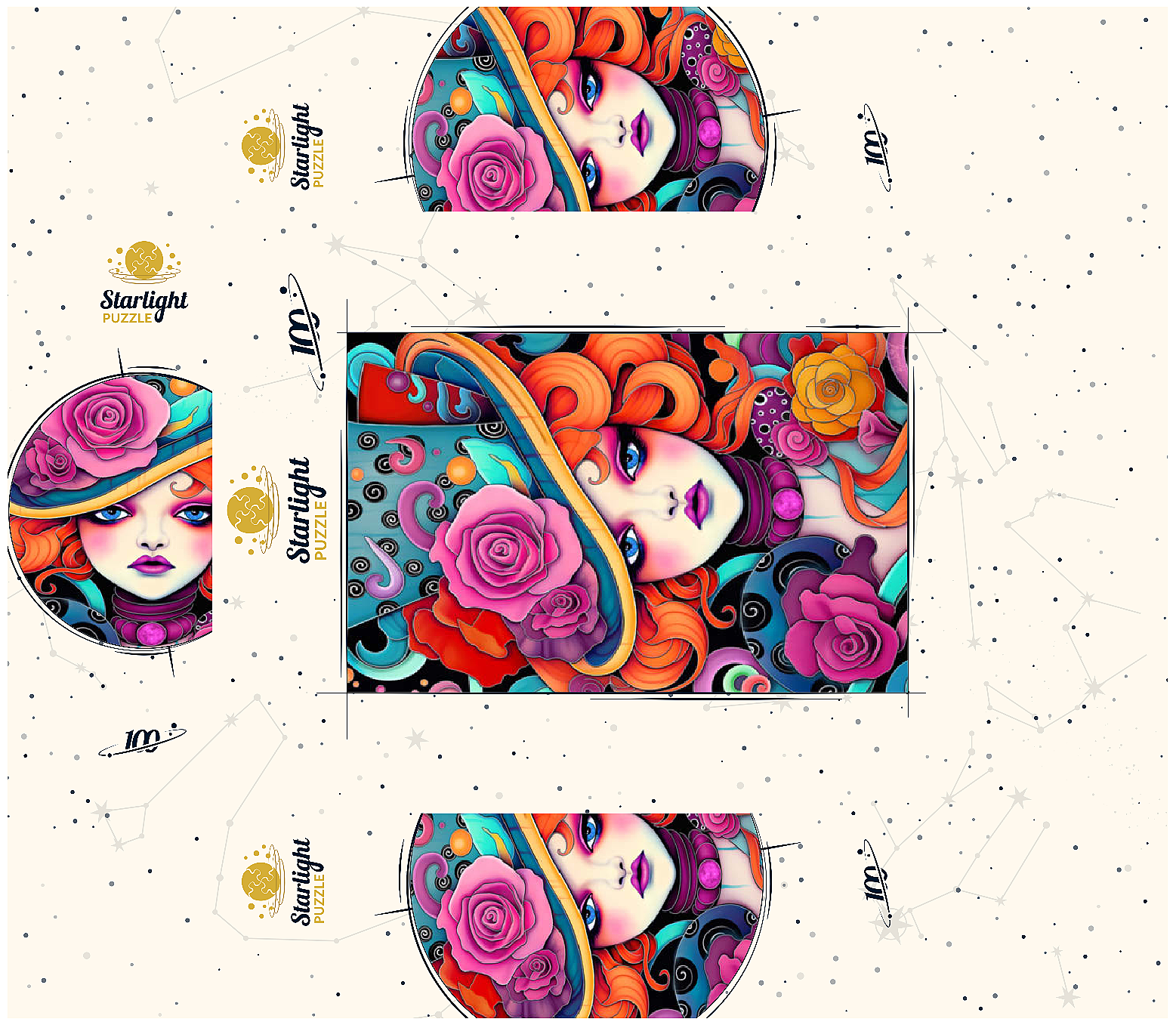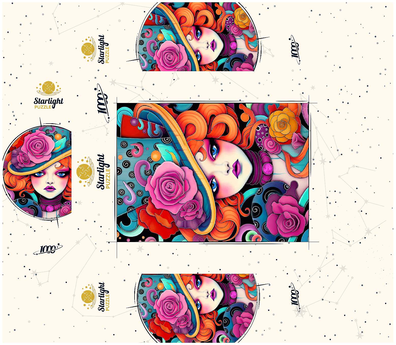 A stunning digital fantasy portrait of a red-haired woman with vivid blue eyes, wearing a tall, surreal hat adorned with vibrant roses and whimsical swirling patterns. her porcelain-like complexion contrasts with the bold, saturated colors of her outfit and background, featuring pinks, purples, teals, and oranges. the floral and abstract elements blend harmoniously, creating a dreamy, Art Nouveau-inspired aesthetic. this imaginative artwork radiates a blend of elegance, mystery, and eccentric charm, perfect for lovers of bold, artistic expressions.