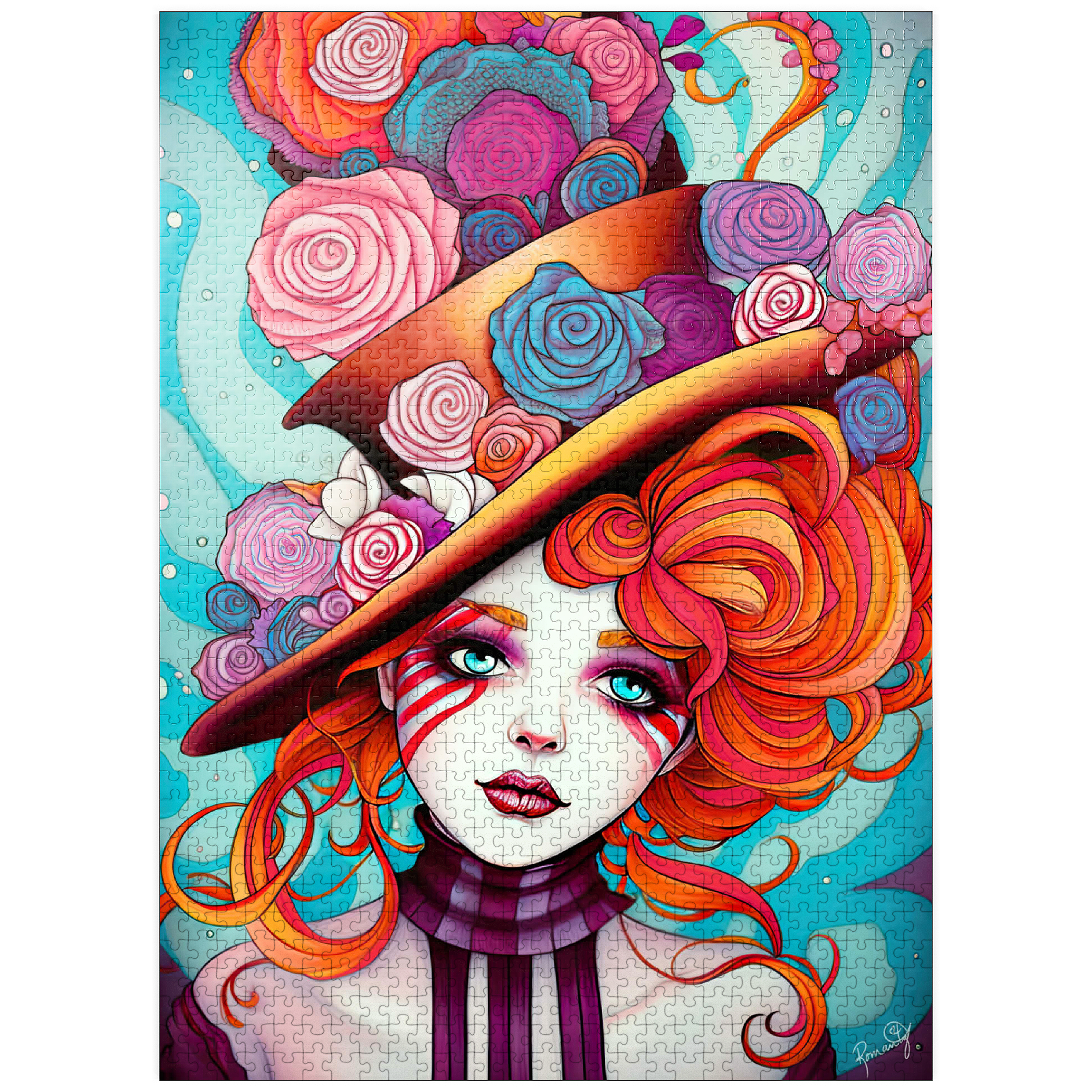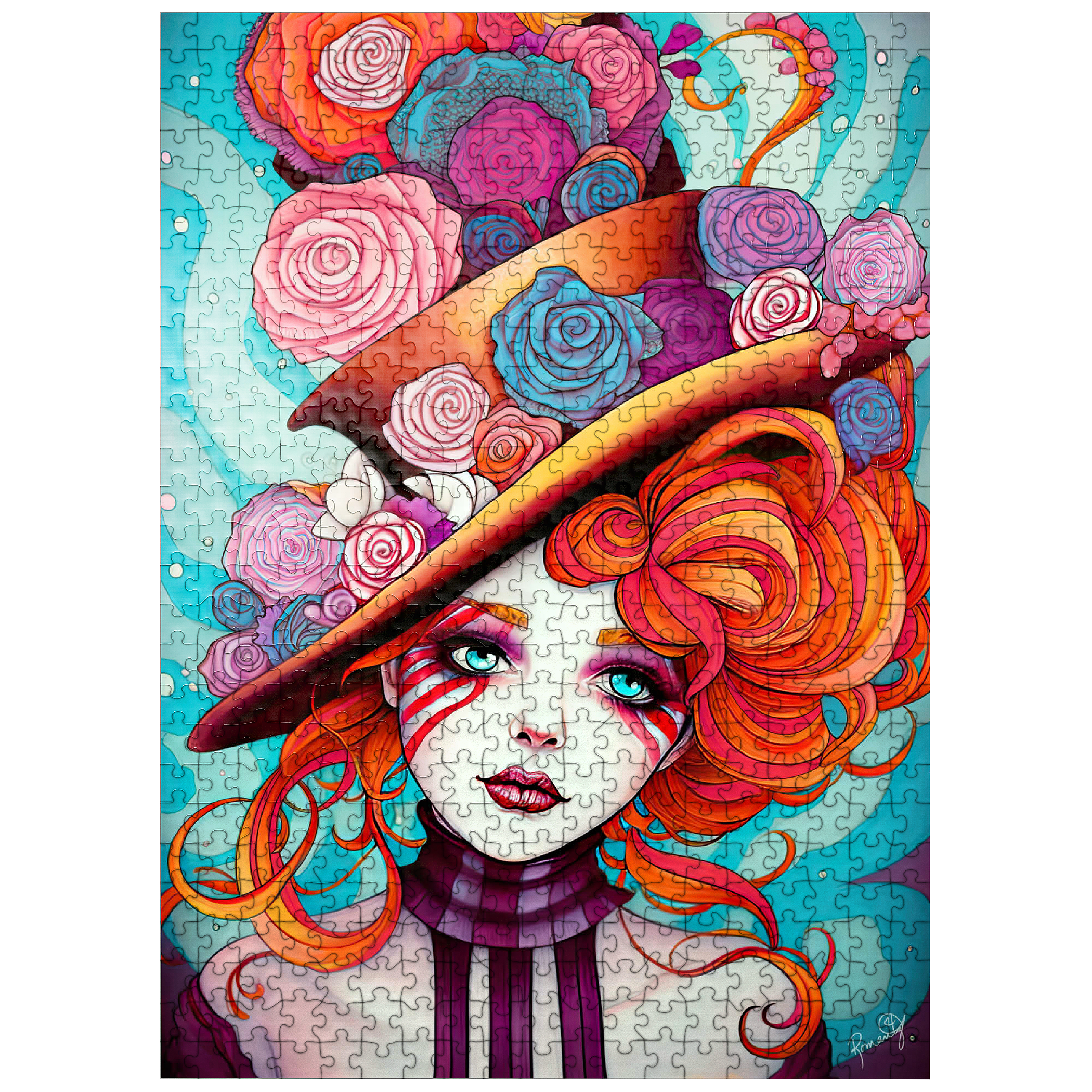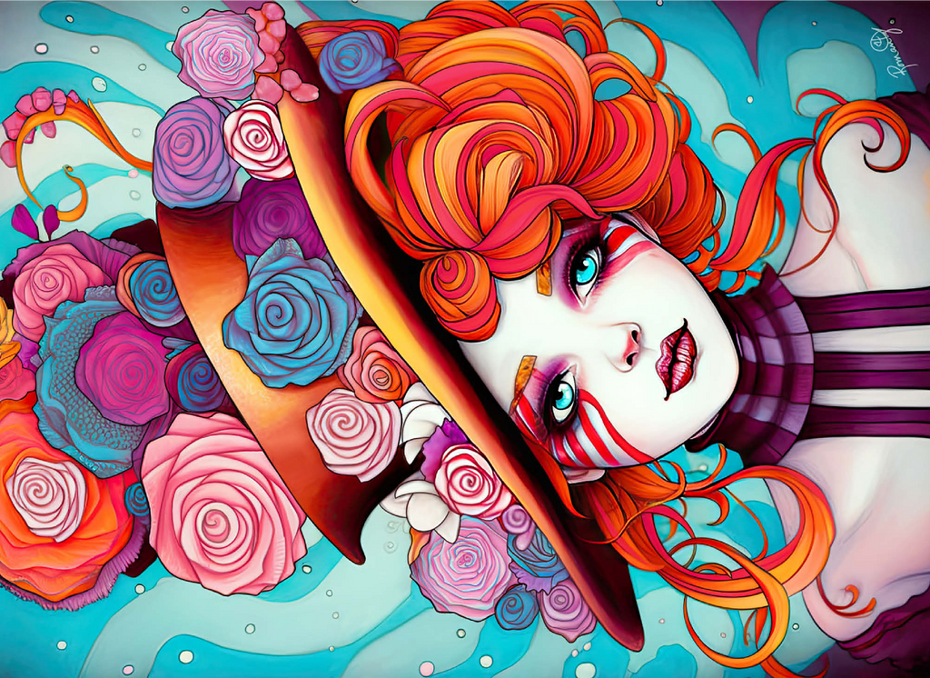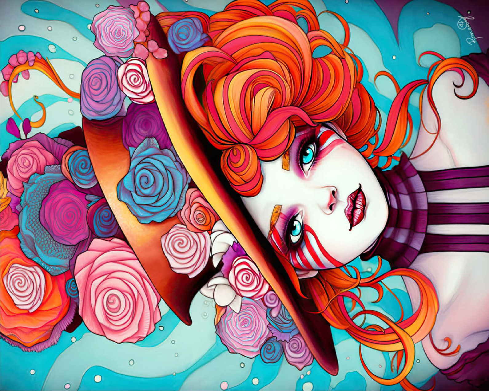 A vivid and whimsical portrait of a young woman with striking red-orange curls and sky-blue eyes, adorned in a surreal top hat overflowing with colorful roses in shades of pink, purple, and blue. Her porcelain-like skin is accentuated with bold red face paint under her eyes, giving her a theatrical, fantasy allure. The turquoise background contrasts beautifully with the warmth of the floral explosion and the cool tones of her gaze. This fantasy-style artwork evokes a dreamlike, imaginative world full of color, expression, and enchanting elegance.