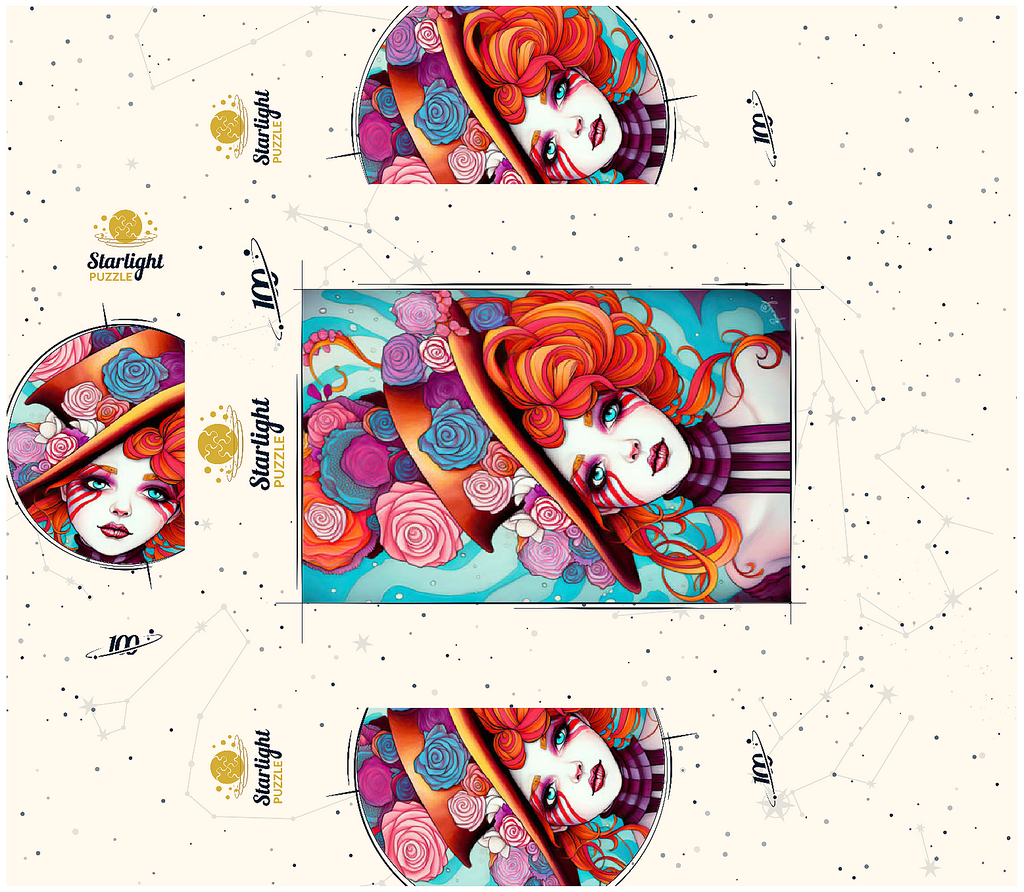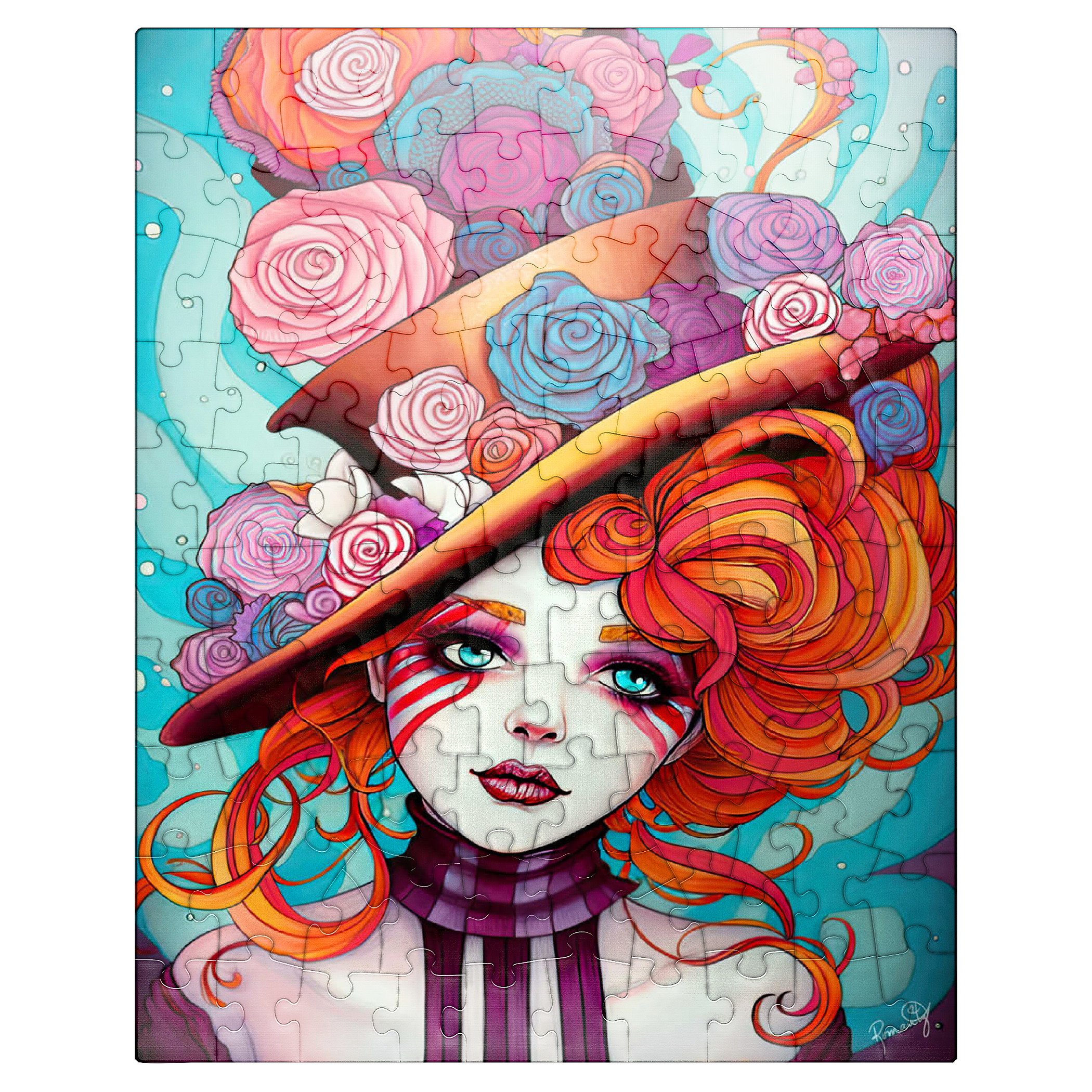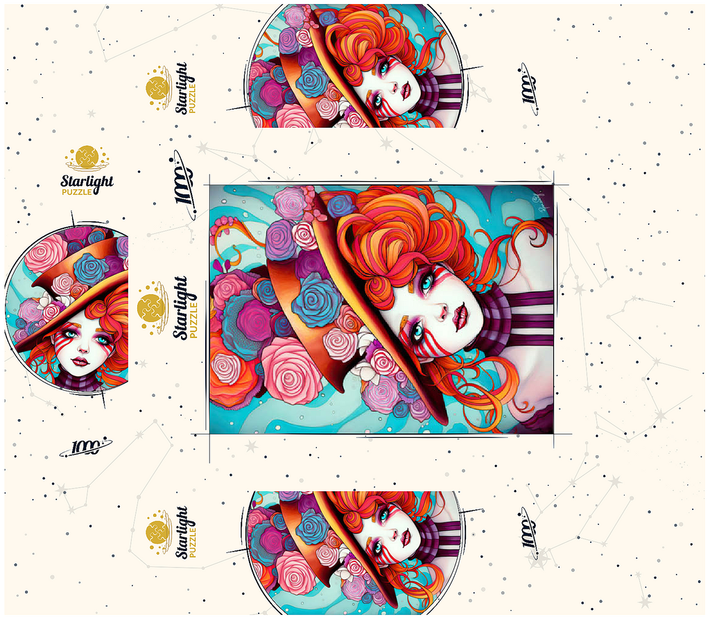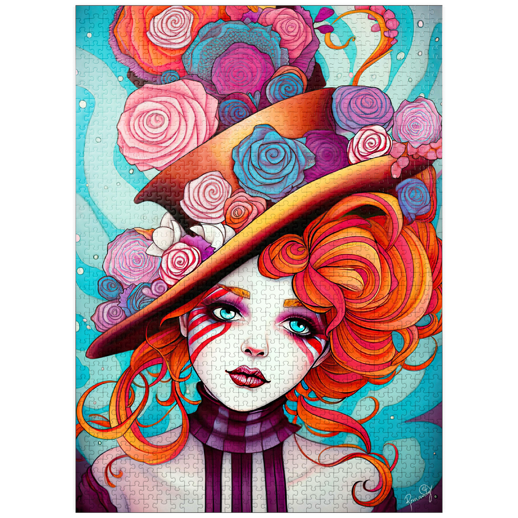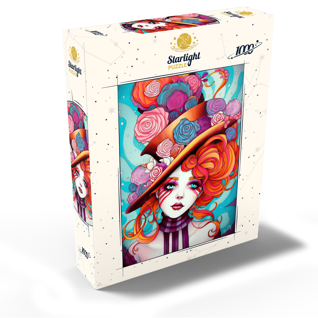 A vivid and whimsical portrait of a young woman with striking red-orange curls and sky-blue eyes, adorned in a surreal top hat overflowing with colorful roses in shades of pink, purple, and blue. Her porcelain-like skin is accentuated with bold red face paint under her eyes, giving her a theatrical, fantasy allure. The turquoise background contrasts beautifully with the warmth of the floral explosion and the cool tones of her gaze. This fantasy-style artwork evokes a dreamlike, imaginative world full of color, expression, and enchanting elegance.