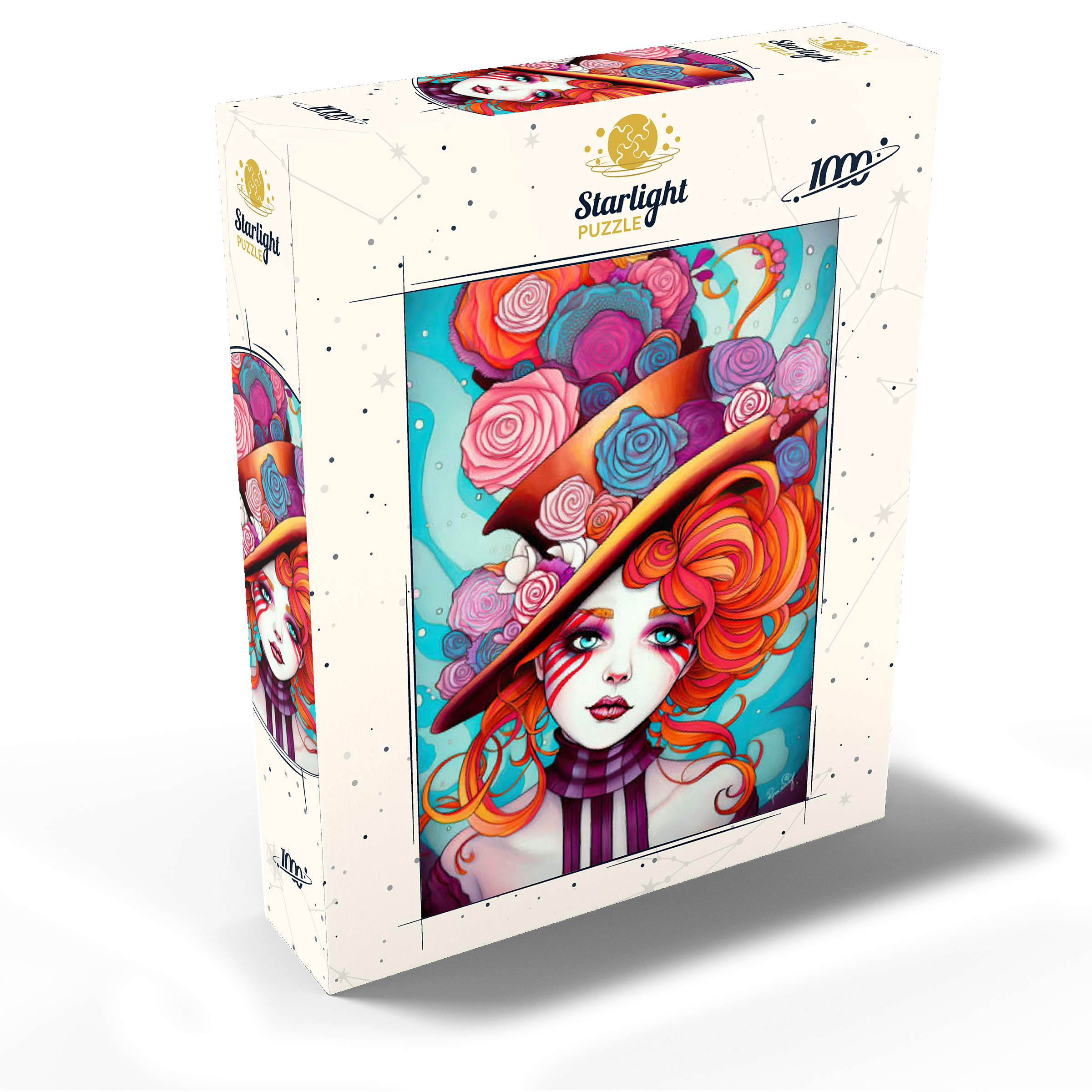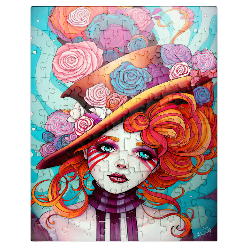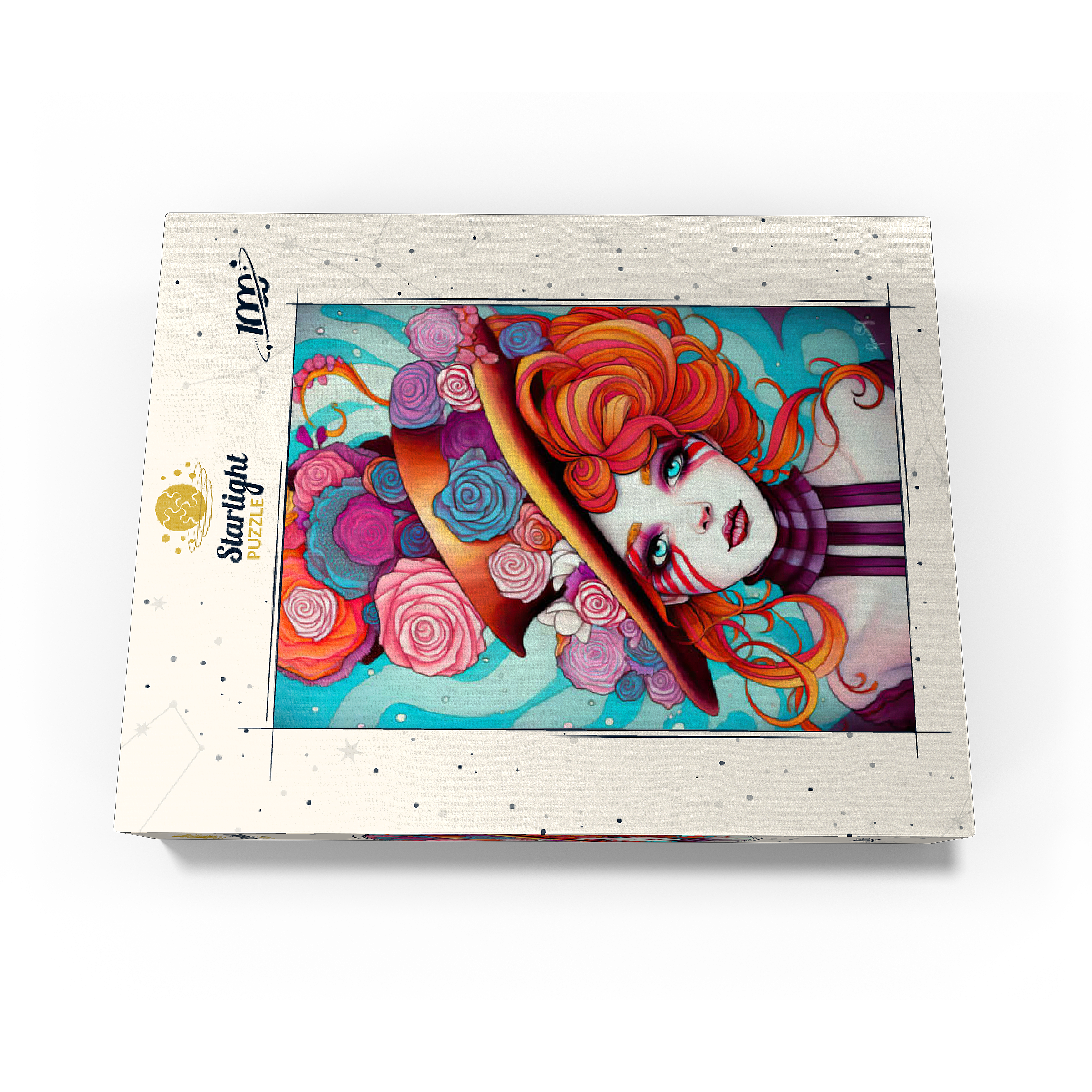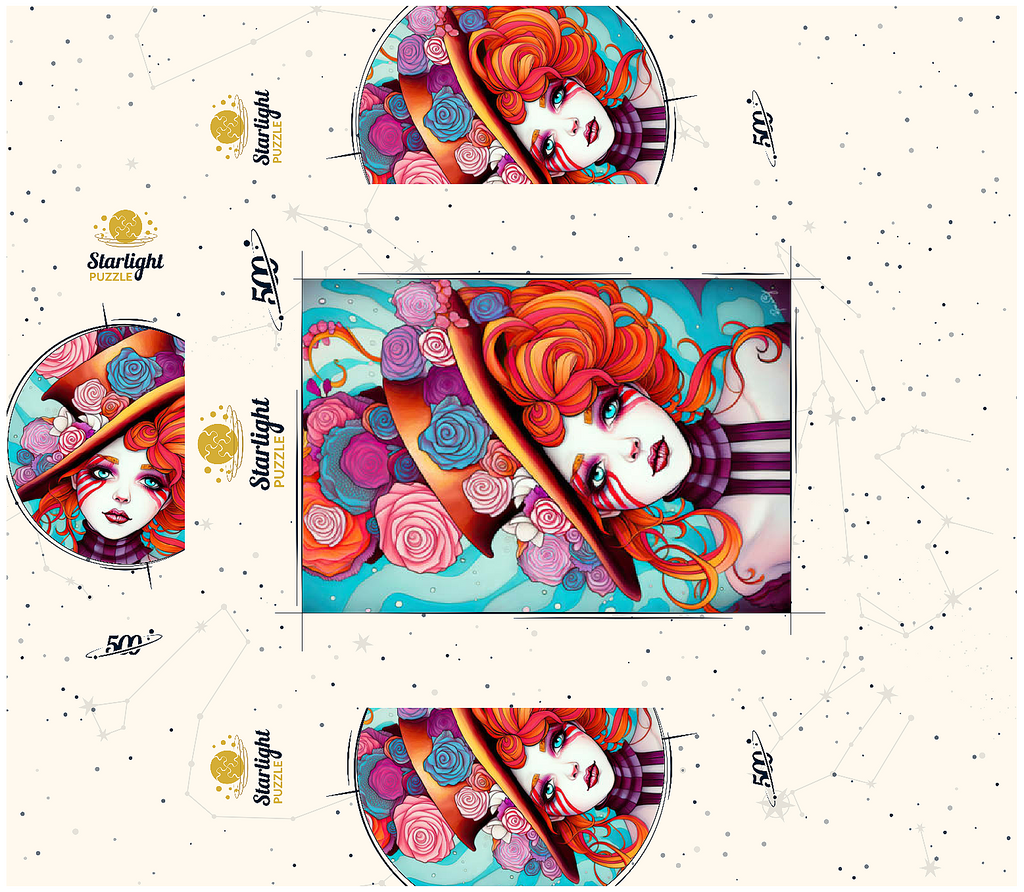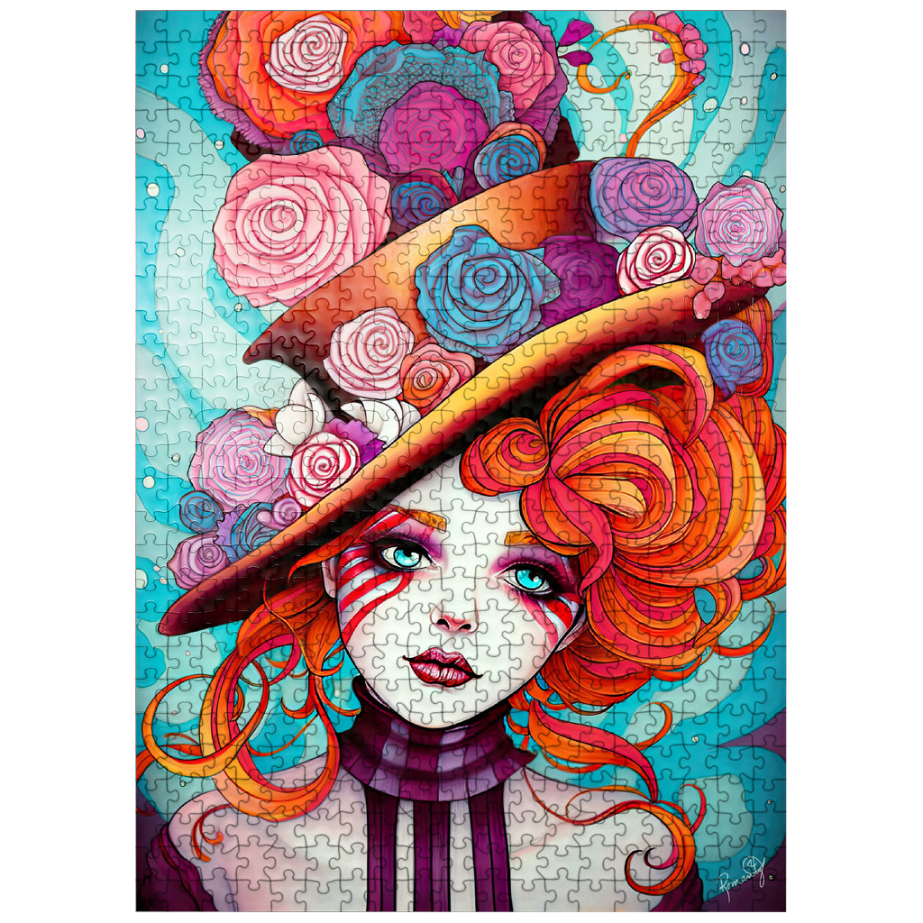 A vivid and whimsical portrait of a young woman with striking red-orange curls and sky-blue eyes, adorned in a surreal top hat overflowing with colorful roses in shades of pink, purple, and blue. Her porcelain-like skin is accentuated with bold red face paint under her eyes, giving her a theatrical, fantasy allure. The turquoise background contrasts beautifully with the warmth of the floral explosion and the cool tones of her gaze. This fantasy-style artwork evokes a dreamlike, imaginative world full of color, expression, and enchanting elegance.