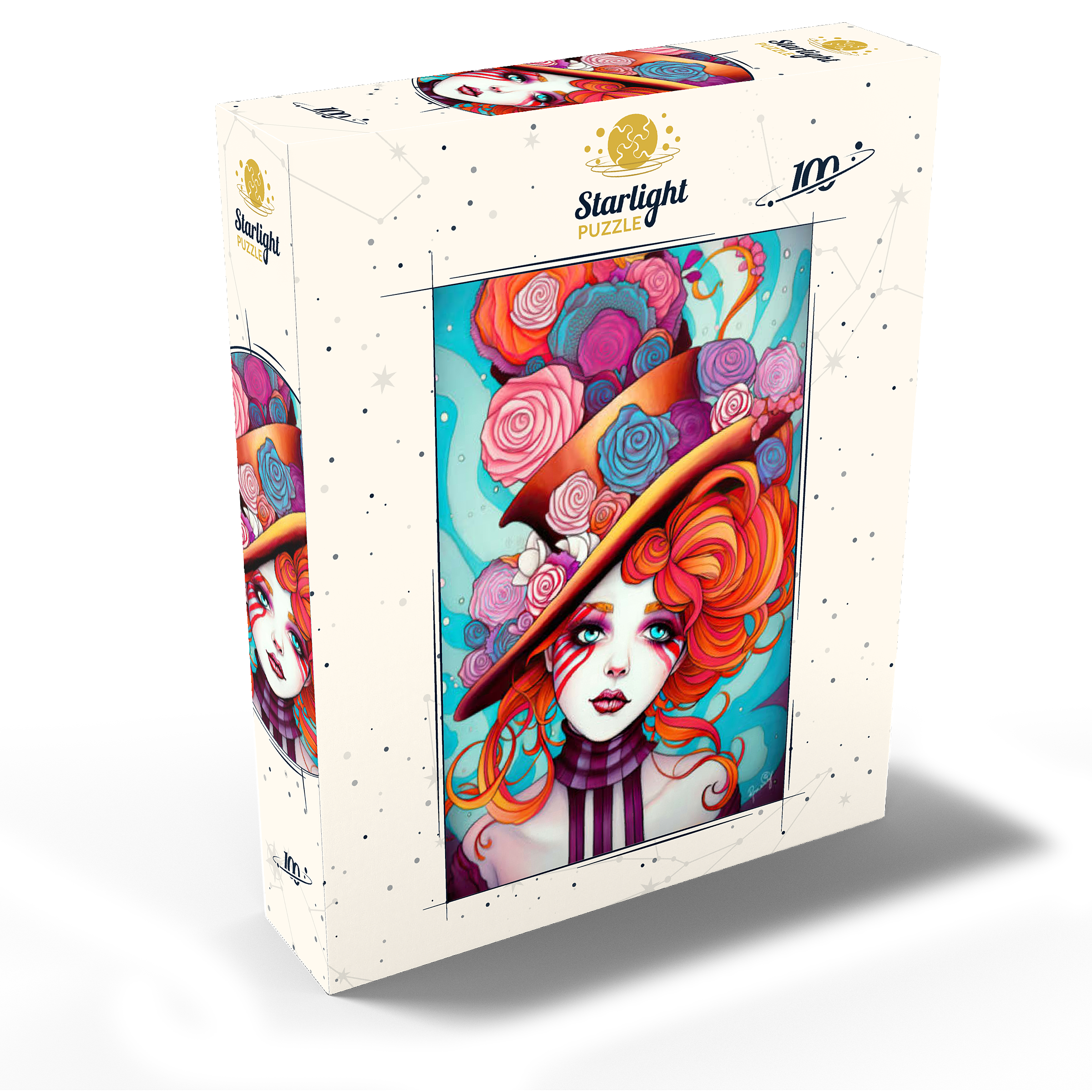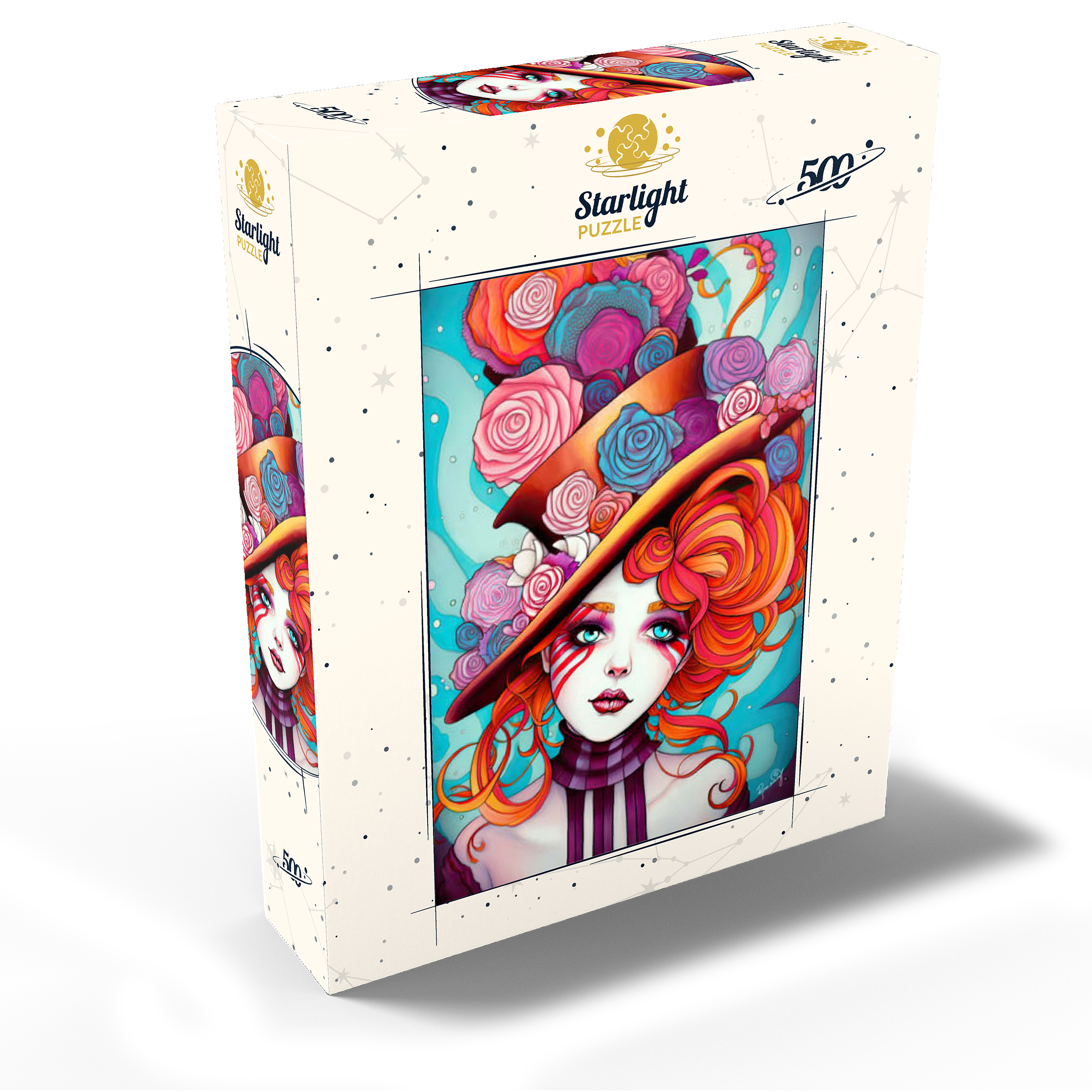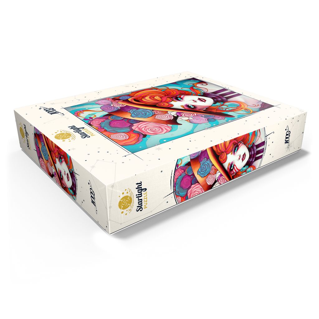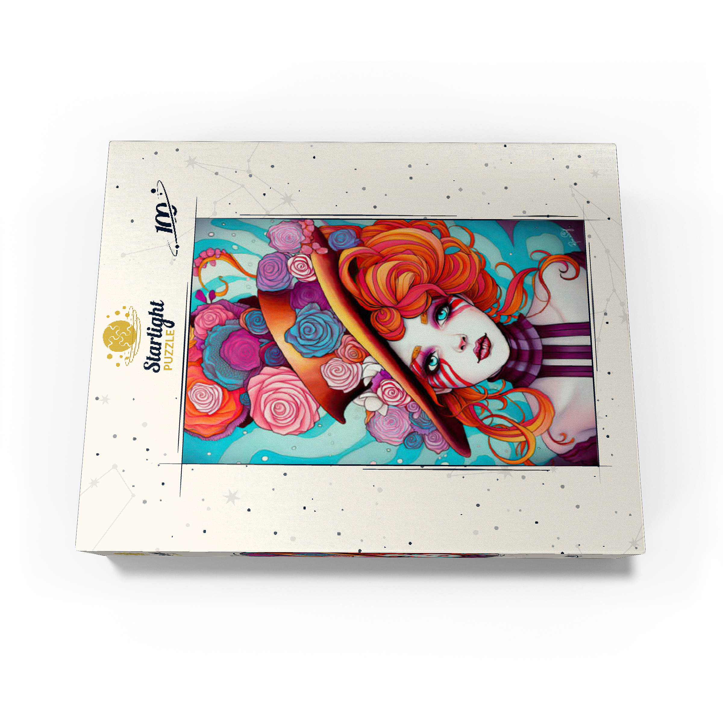 A vivid and whimsical portrait of a young woman with striking red-orange curls and sky-blue eyes, adorned in a surreal top hat overflowing with colorful roses in shades of pink, purple, and blue. Her porcelain-like skin is accentuated with bold red face paint under her eyes, giving her a theatrical, fantasy allure. The turquoise background contrasts beautifully with the warmth of the floral explosion and the cool tones of her gaze. This fantasy-style artwork evokes a dreamlike, imaginative world full of color, expression, and enchanting elegance.
