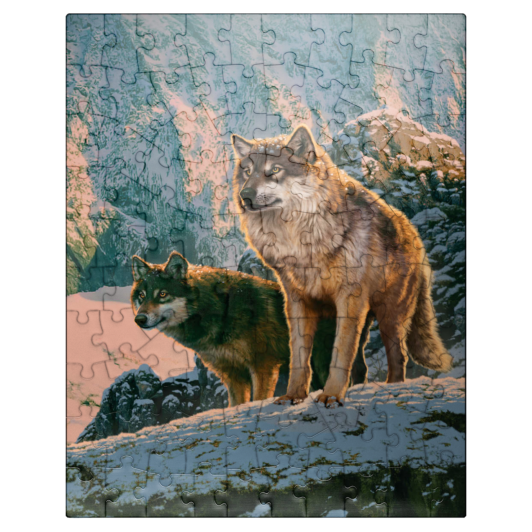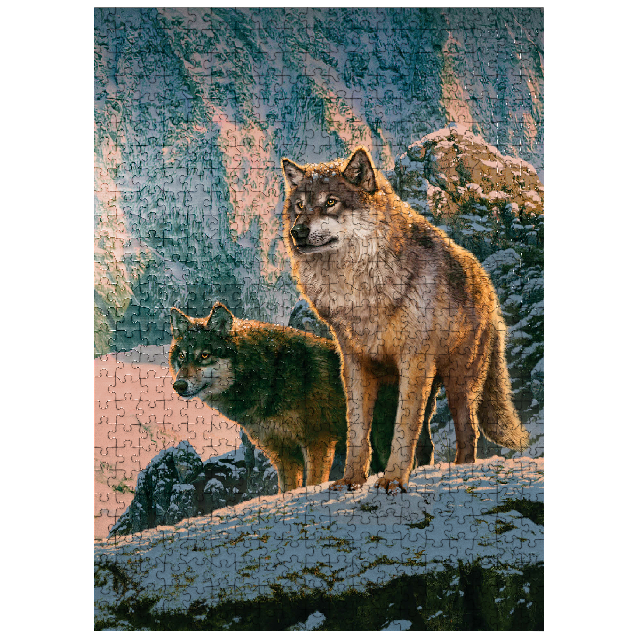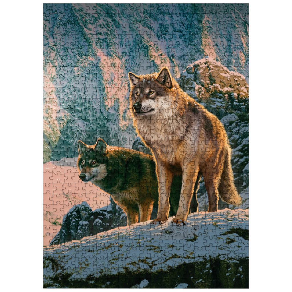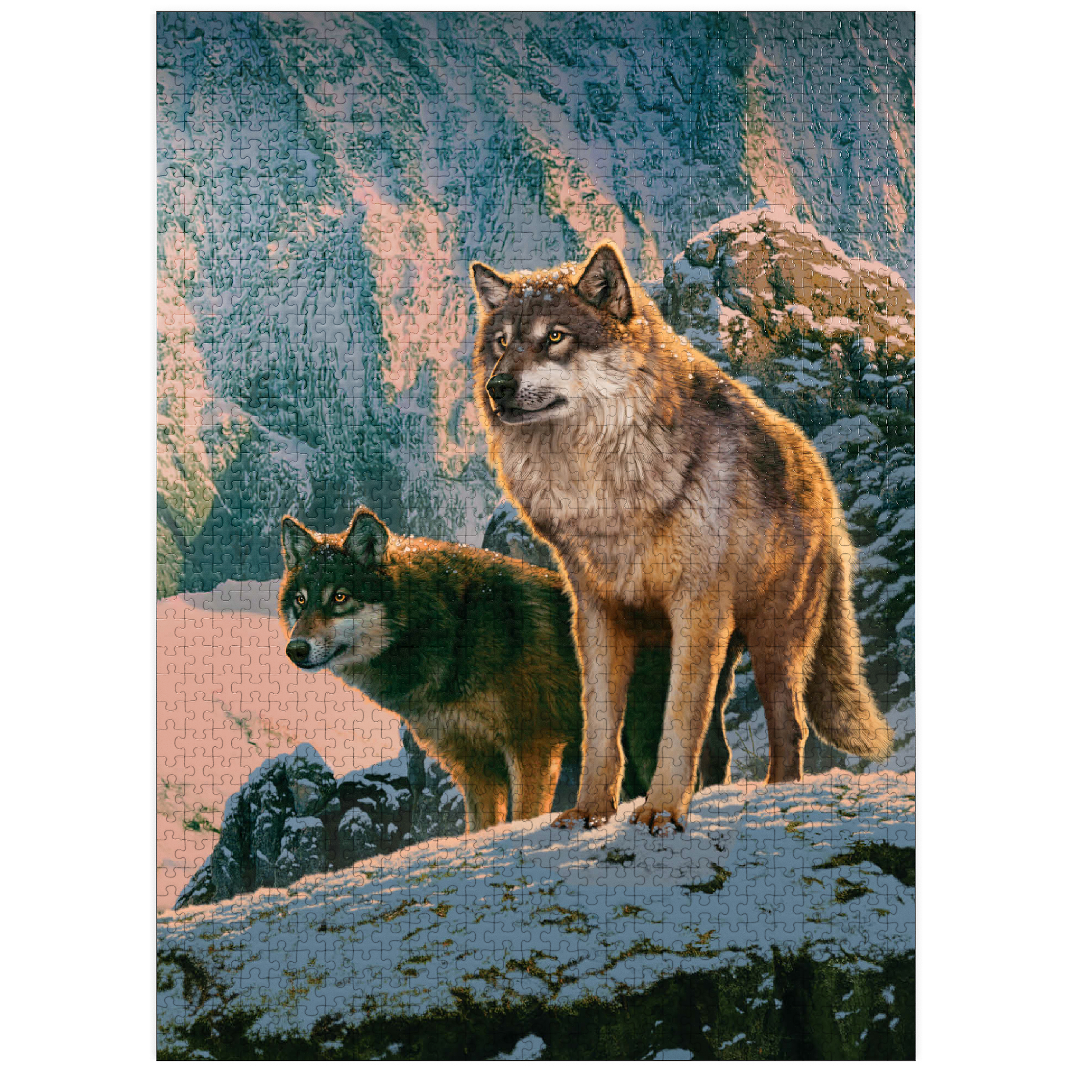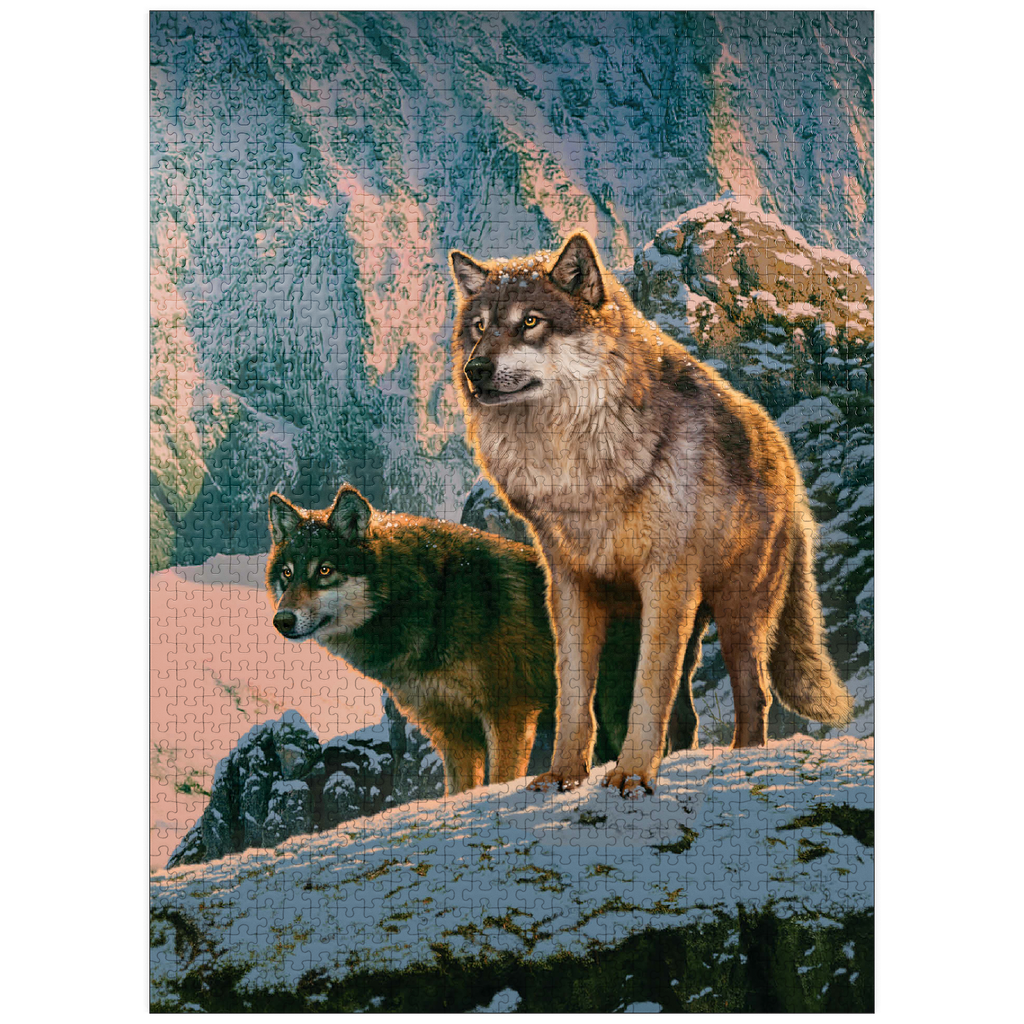 The artwork depicts a wolf couple standing on a snow-covered rocky outcrop against a backdrop of a dramatic, snow-capped mountain range. The wolves are rendered in detail, showing their fur texture and intense gaze. The setting sun casts a warm glow on the scene, creating a serene yet powerful atmosphere. The overall composition evokes a sense of wildness and majestic beauty.