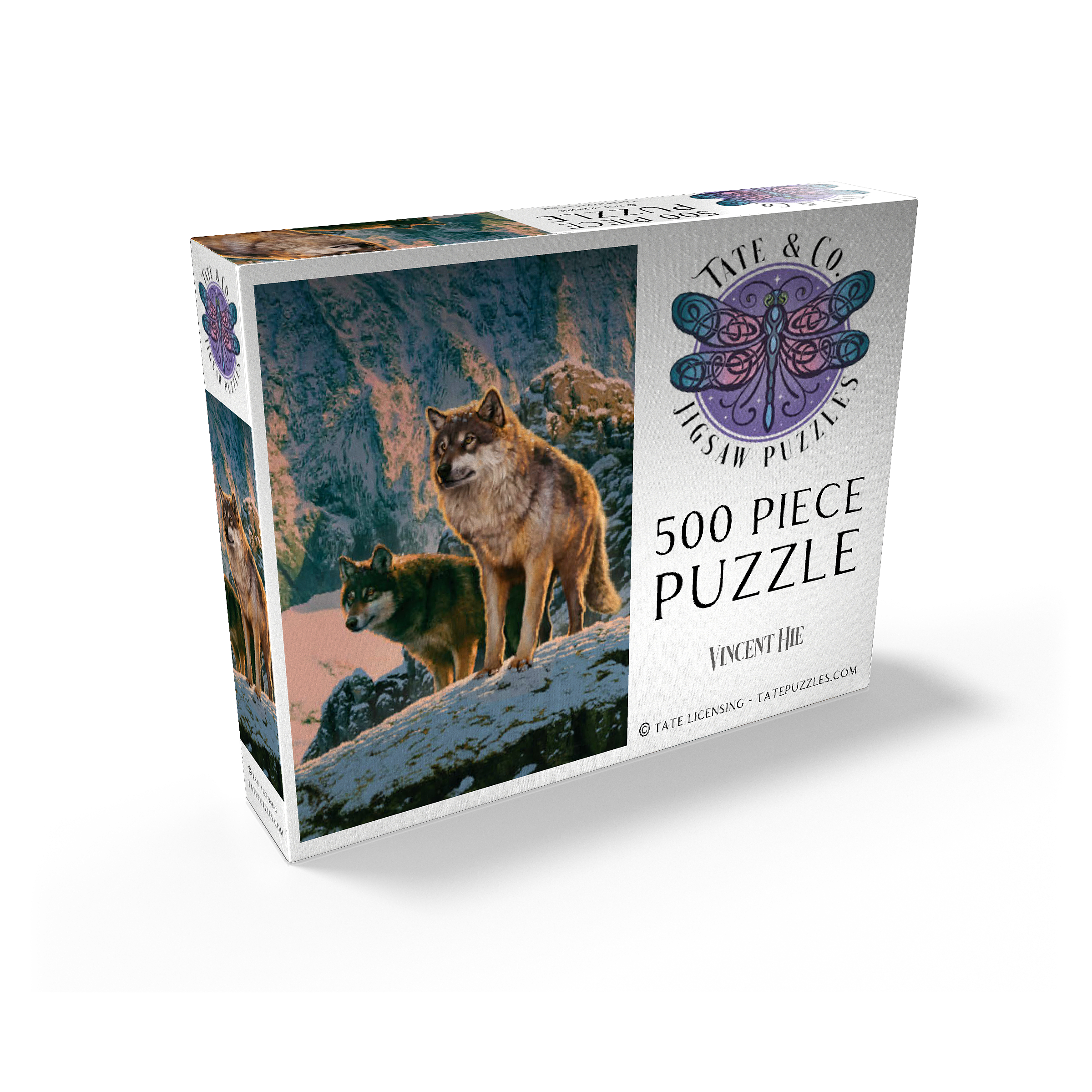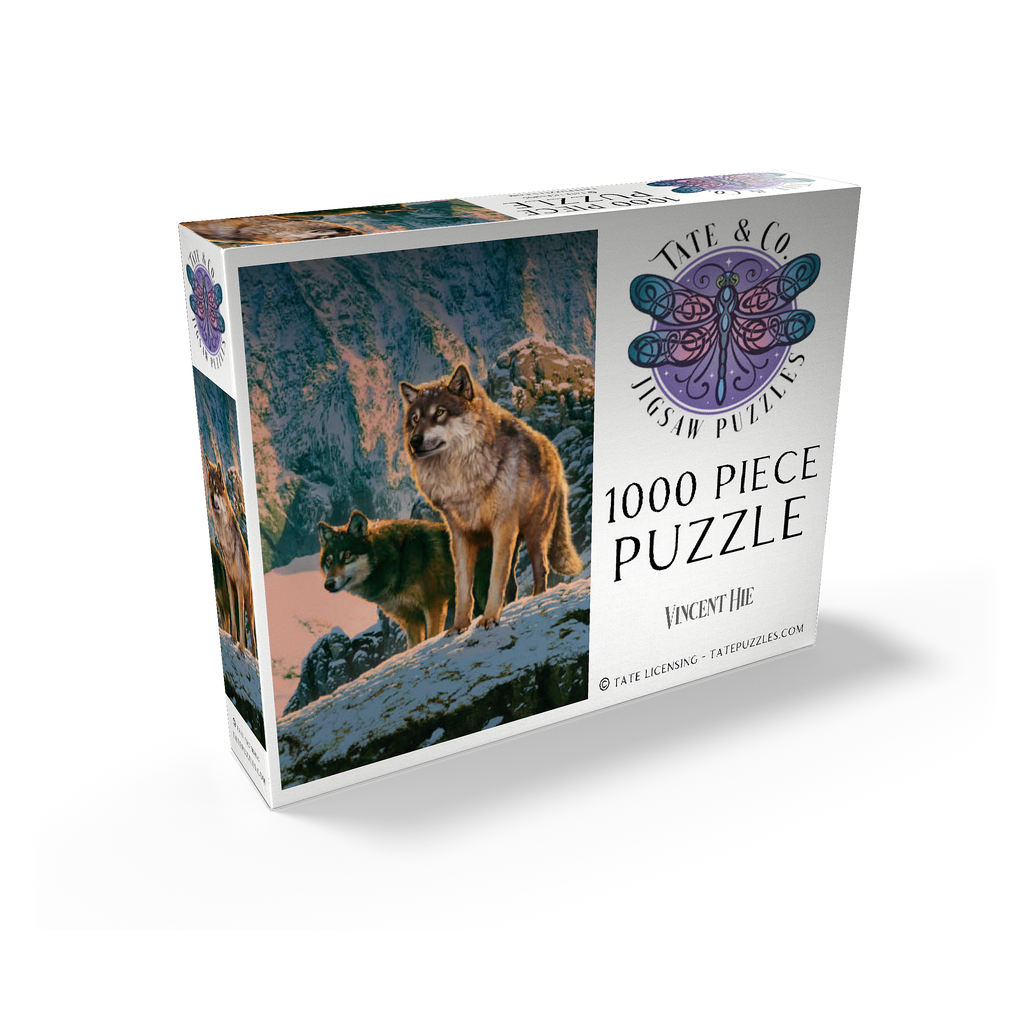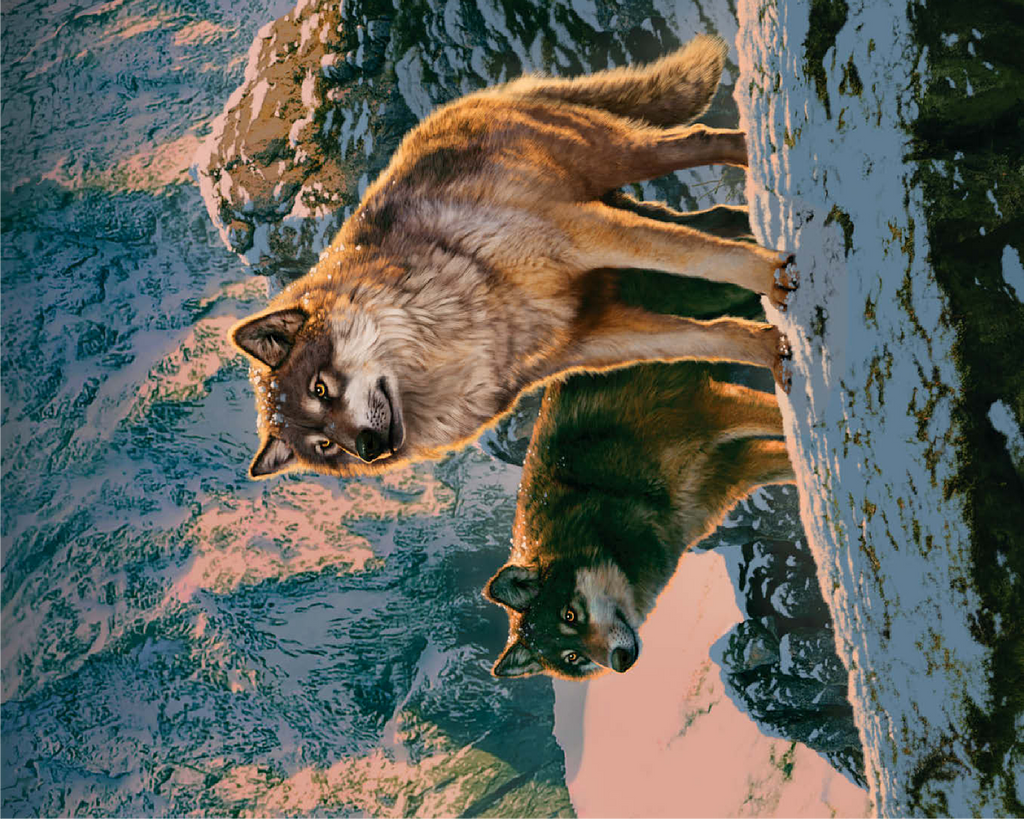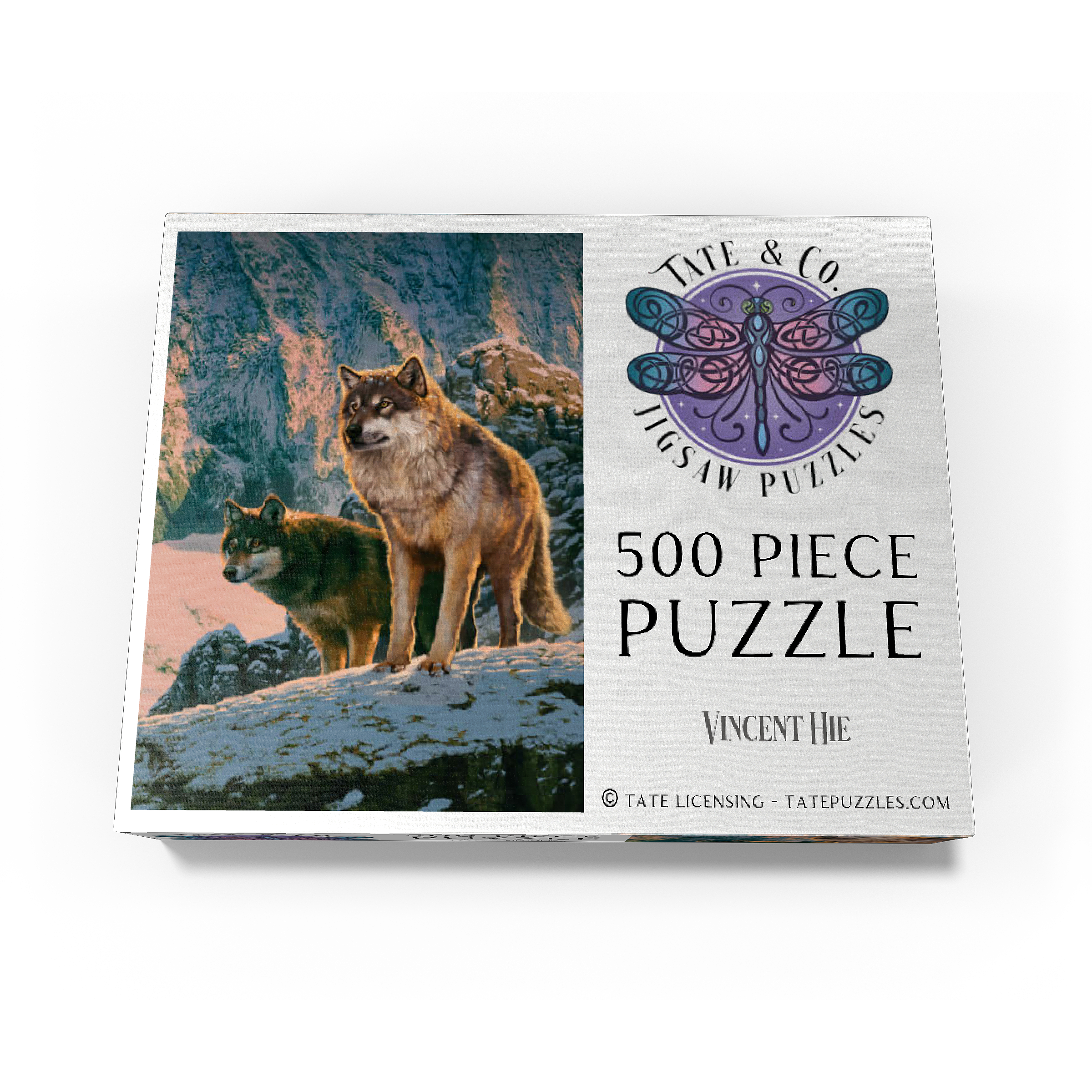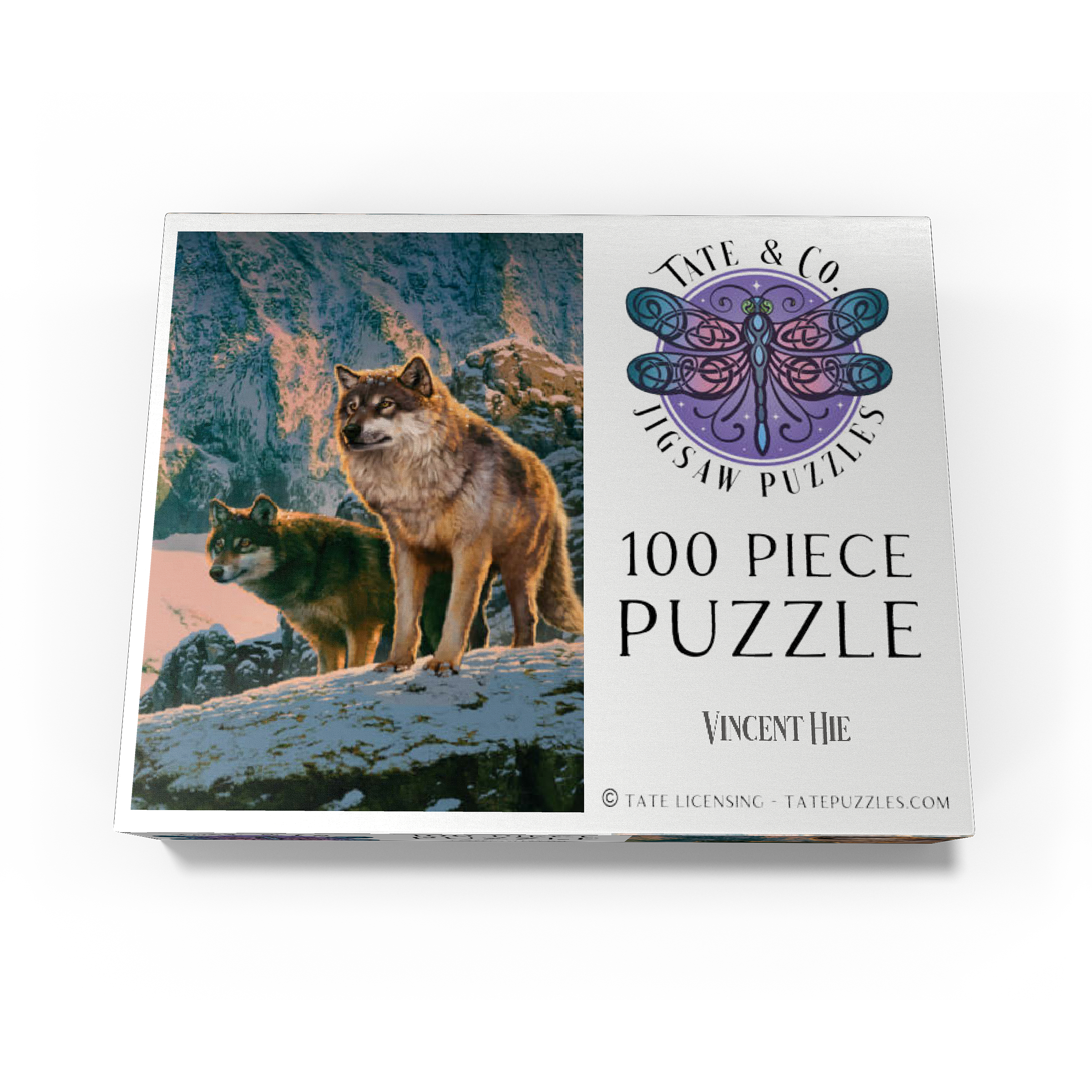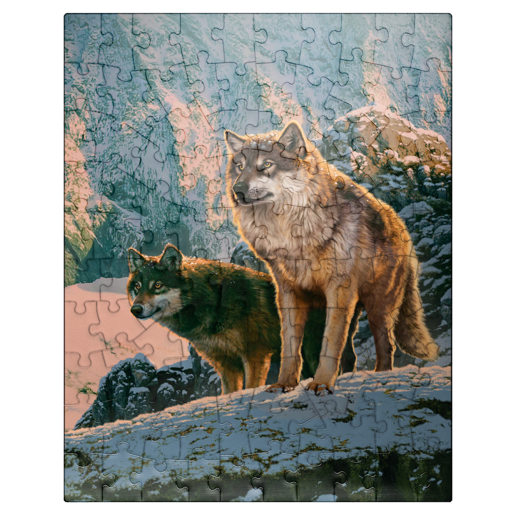 The artwork depicts a wolf couple standing on a snow-covered rocky outcrop against a backdrop of a dramatic, snow-capped mountain range. The wolves are rendered in detail, showing their fur texture and intense gaze. The setting sun casts a warm glow on the scene, creating a serene yet powerful atmosphere. The overall composition evokes a sense of wildness and majestic beauty.