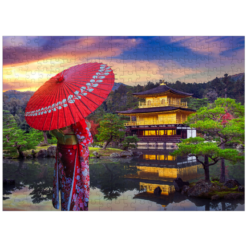 Whether you're a seasoned puzzle-solver or new to the hobby, you'll love the challenge and enjoyment of piecing together this stunning image. This puzzle is not only a fun and engaging activity, but it's also a great way to learn more about Japan and its rich culture and history. So if you're looking for a fun and educational activity that you can do on your own or with friends and family, this puzzle featuring a woman in a traditional Japanese kimono at the Kinkakuji Temple in Kyoto is the perfect choice.