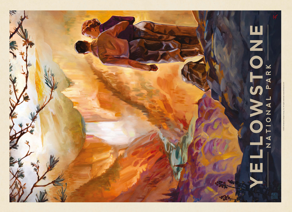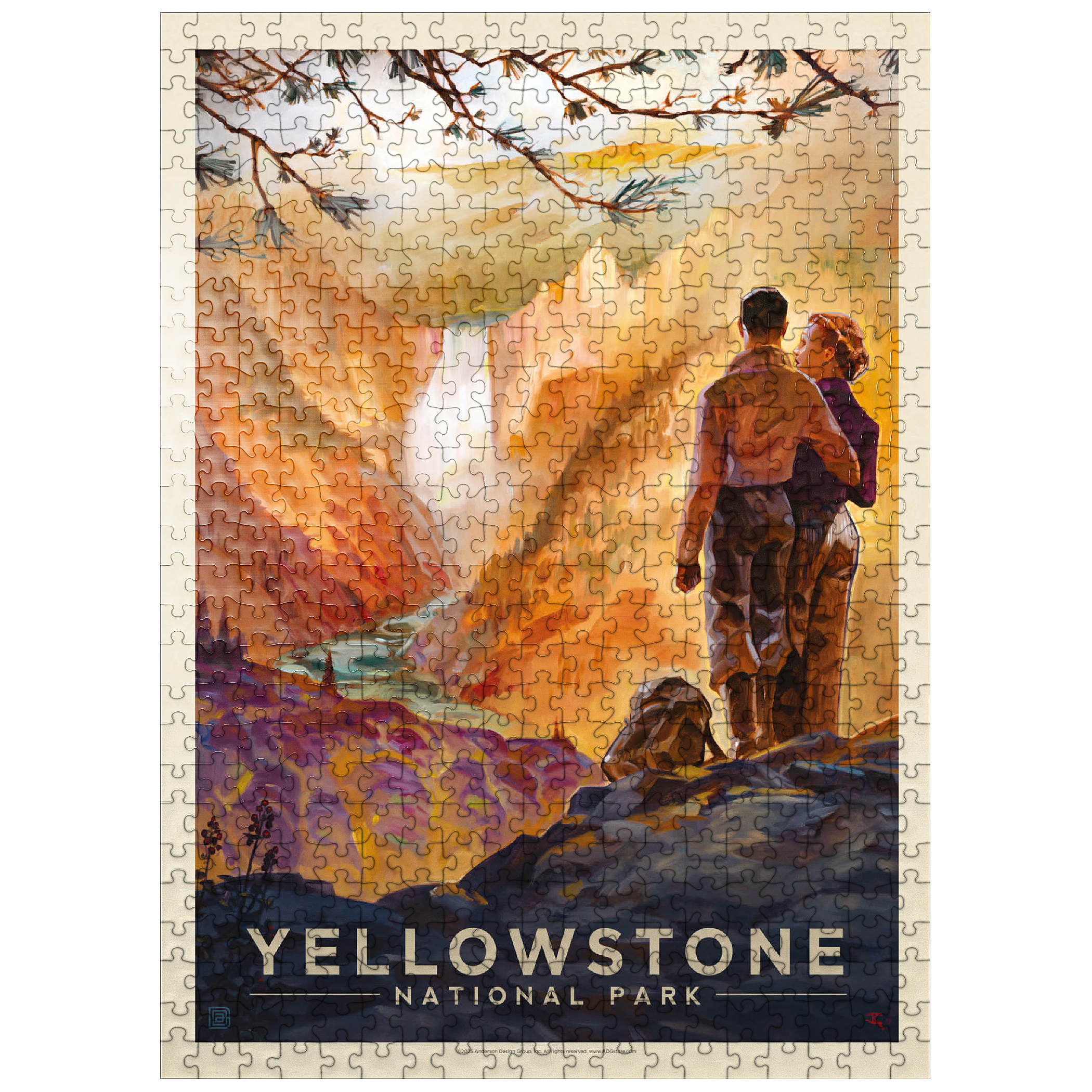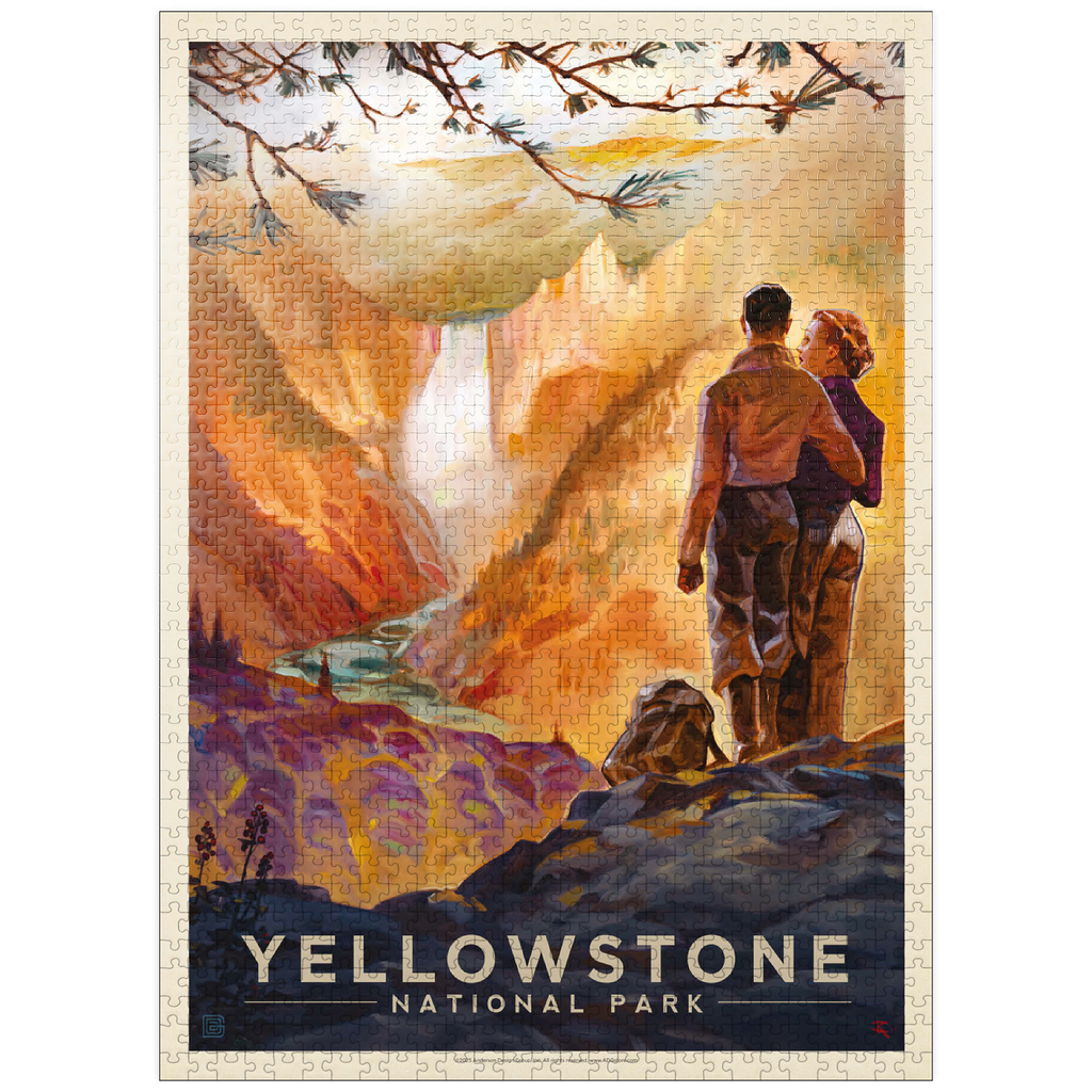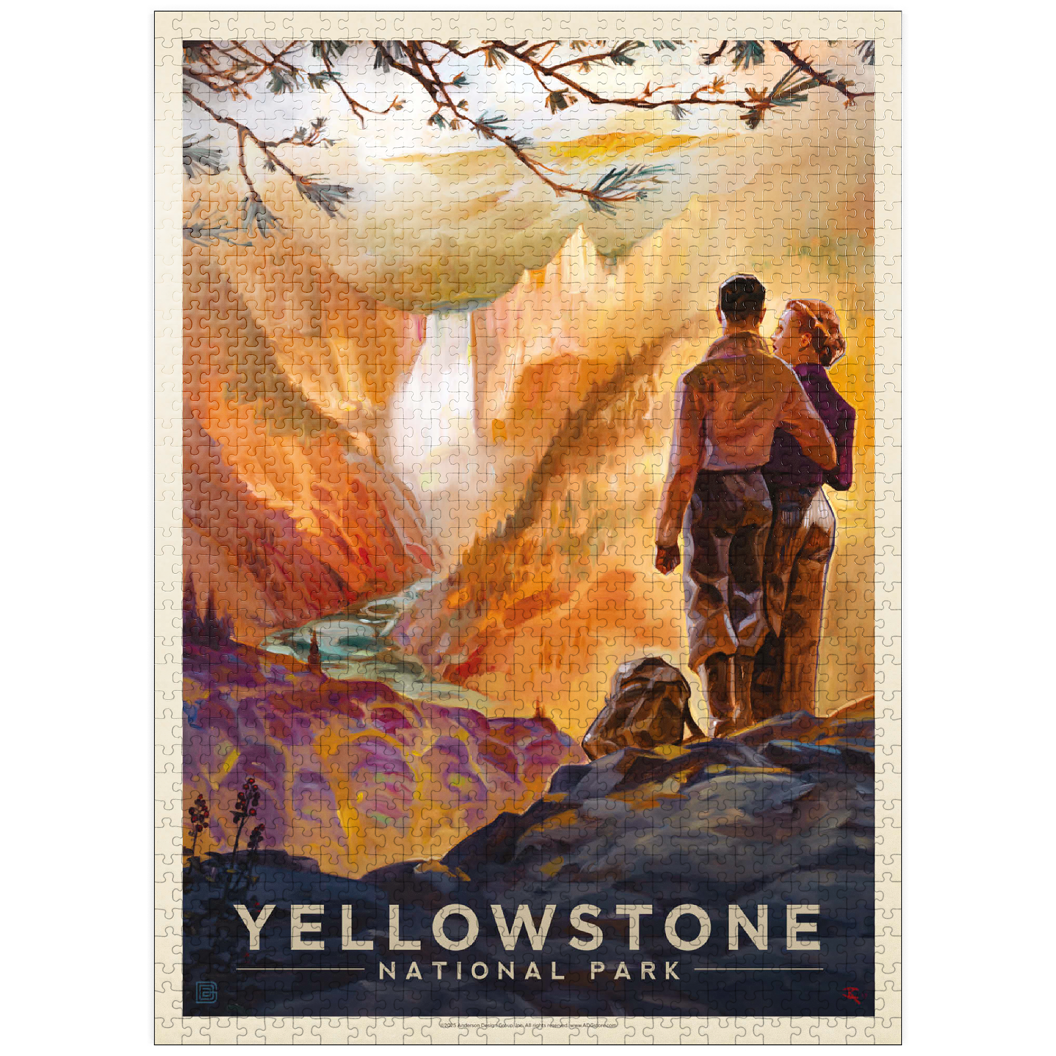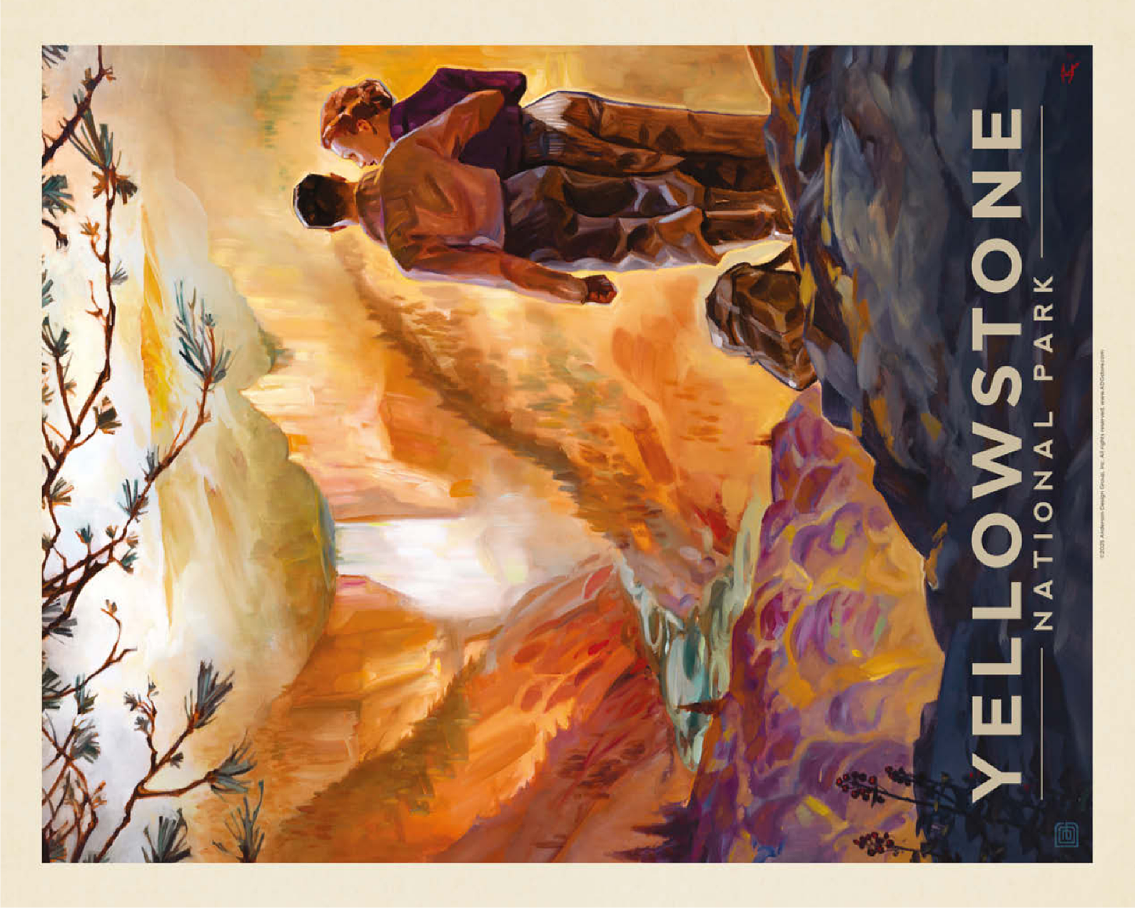 Yellowstone National Park in Wyoming is highlighted in this vivid artistic scene, showcasing the dramatic Lower Falls of the Yellowstone River within the Grand Canyon of Yellowstone. A couple stands at the overlook, gazing across the colorful canyon walls painted in gold, red, and violet hues as the powerful waterfall cascades into the winding river below. This depiction emphasizes the park's breathtaking geology, expansive vistas, and romantic sense of adventure. Established in 1872 as America's first national park, Yellowstone remains world-famous for its waterfalls, geothermal wonders, and diverse wildlife, making it one of the most iconic natural treasures in the United States.