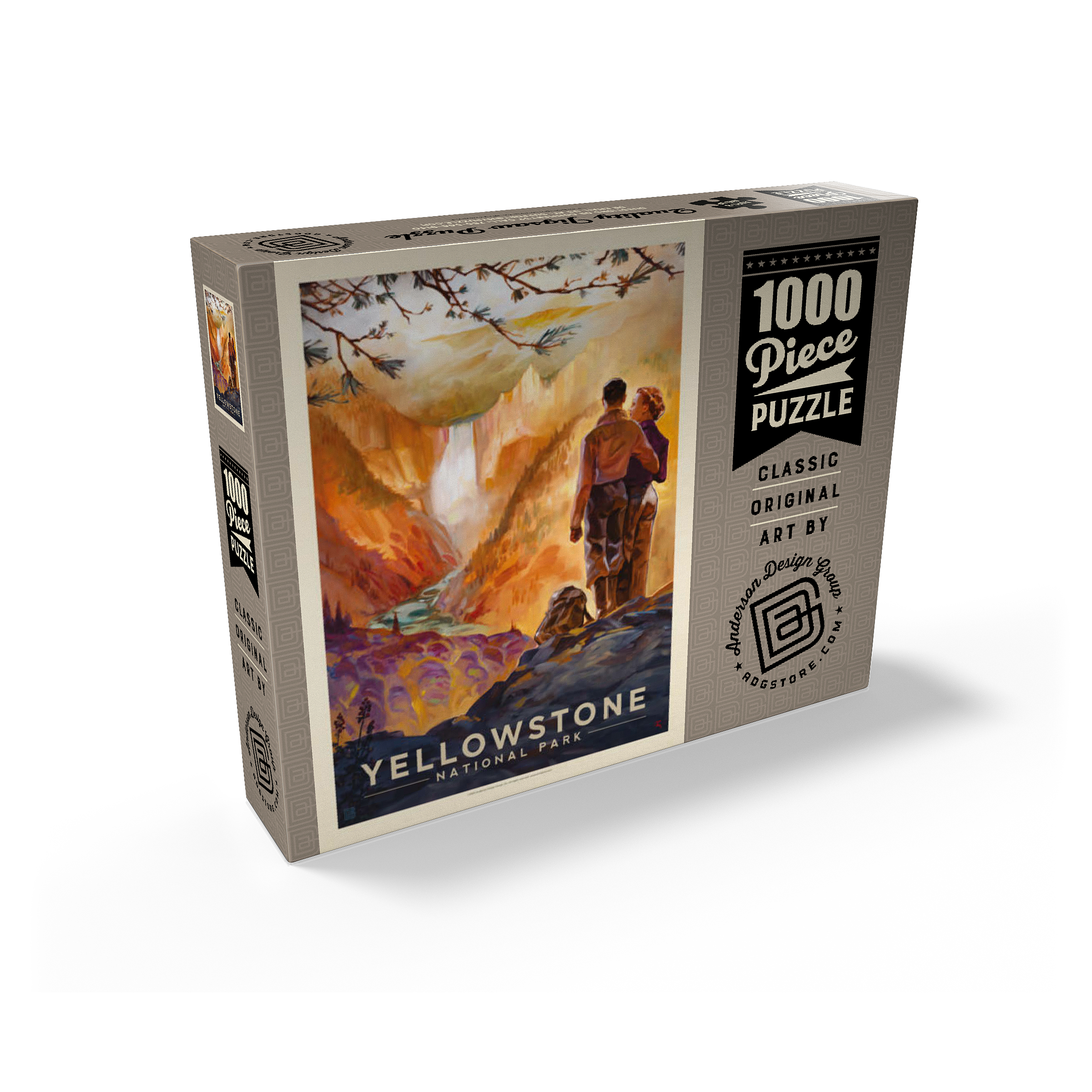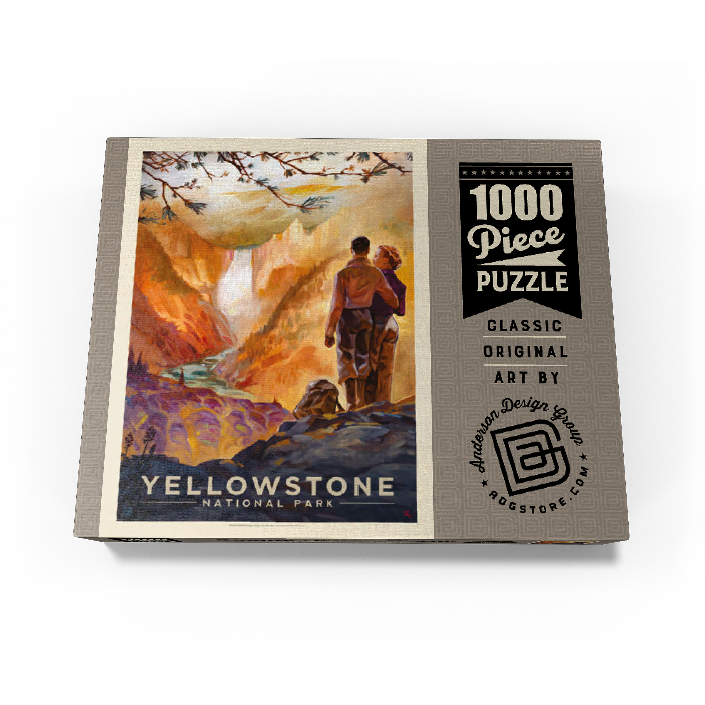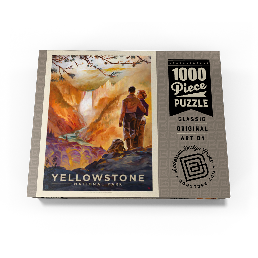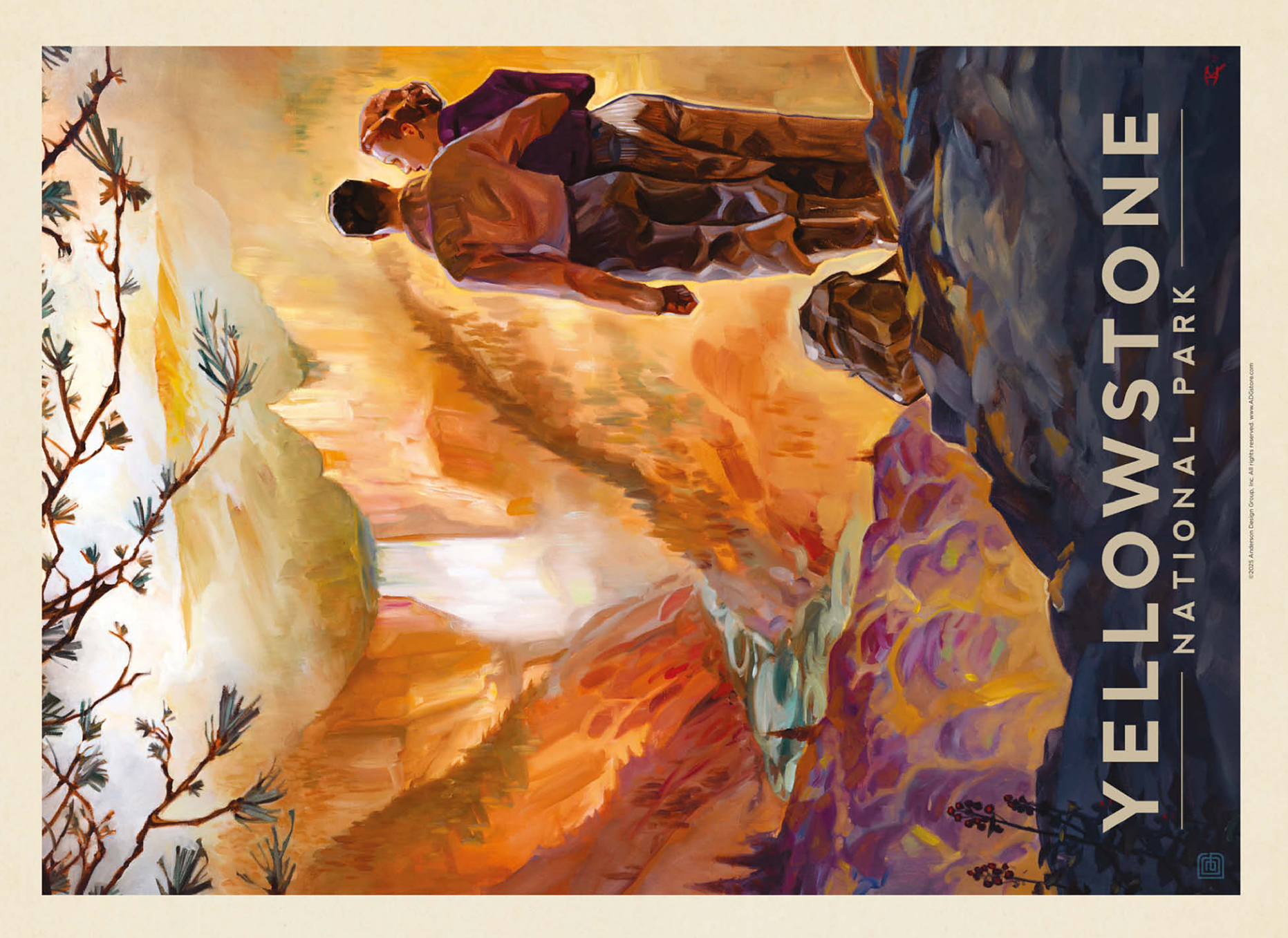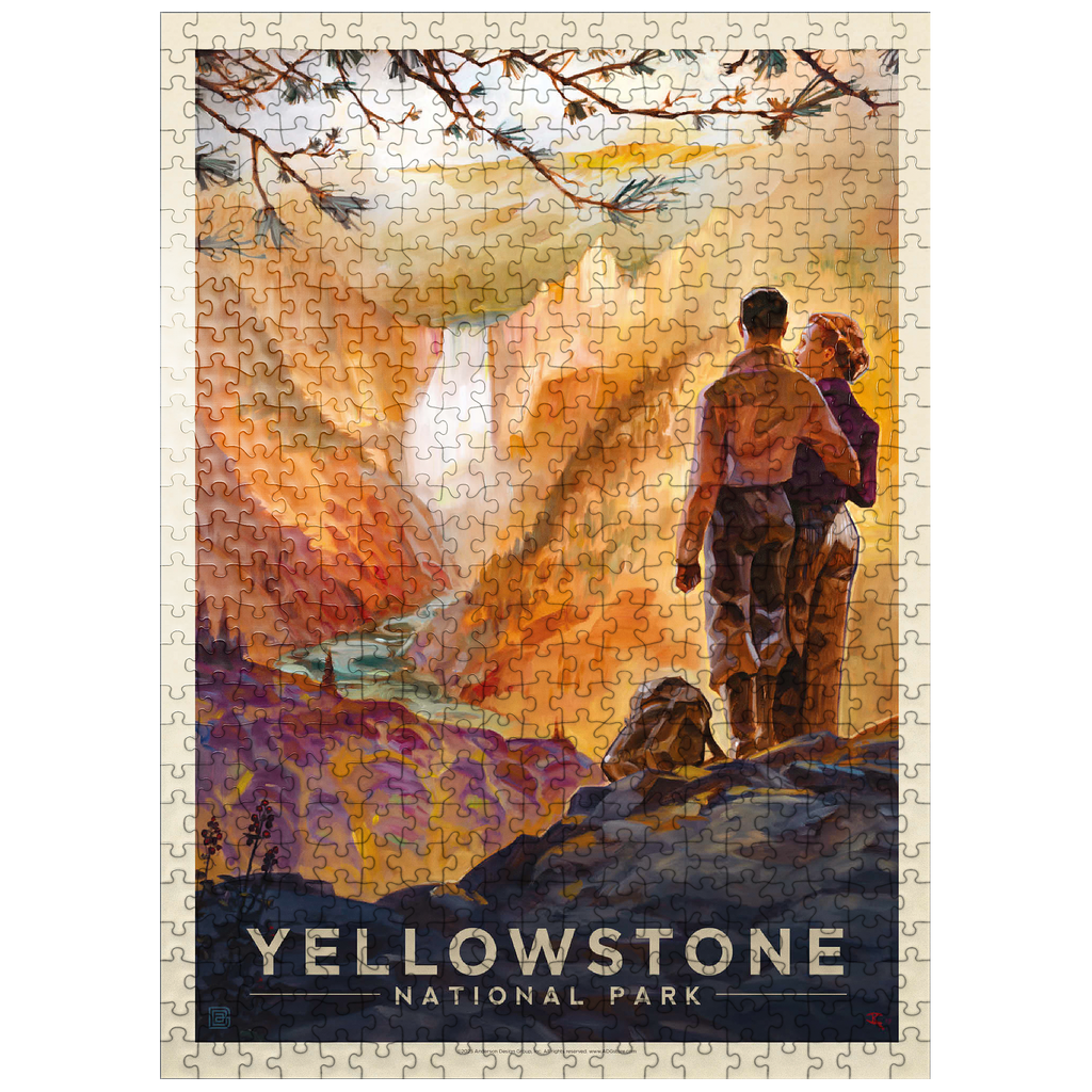 Yellowstone National Park in Wyoming is highlighted in this vivid artistic scene, showcasing the dramatic Lower Falls of the Yellowstone River within the Grand Canyon of Yellowstone. A couple stands at the overlook, gazing across the colorful canyon walls painted in gold, red, and violet hues as the powerful waterfall cascades into the winding river below. This depiction emphasizes the park's breathtaking geology, expansive vistas, and romantic sense of adventure. Established in 1872 as America's first national park, Yellowstone remains world-famous for its waterfalls, geothermal wonders, and diverse wildlife, making it one of the most iconic natural treasures in the United States.