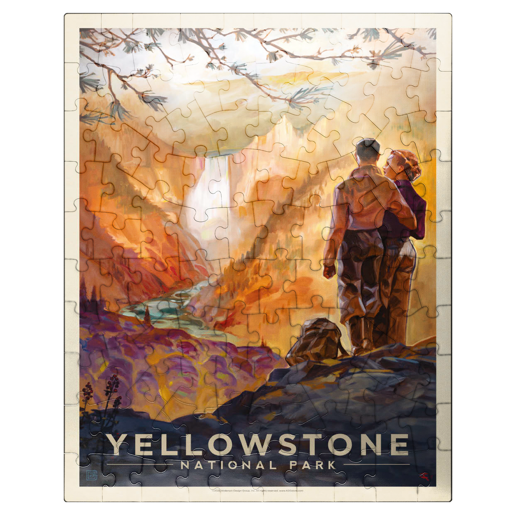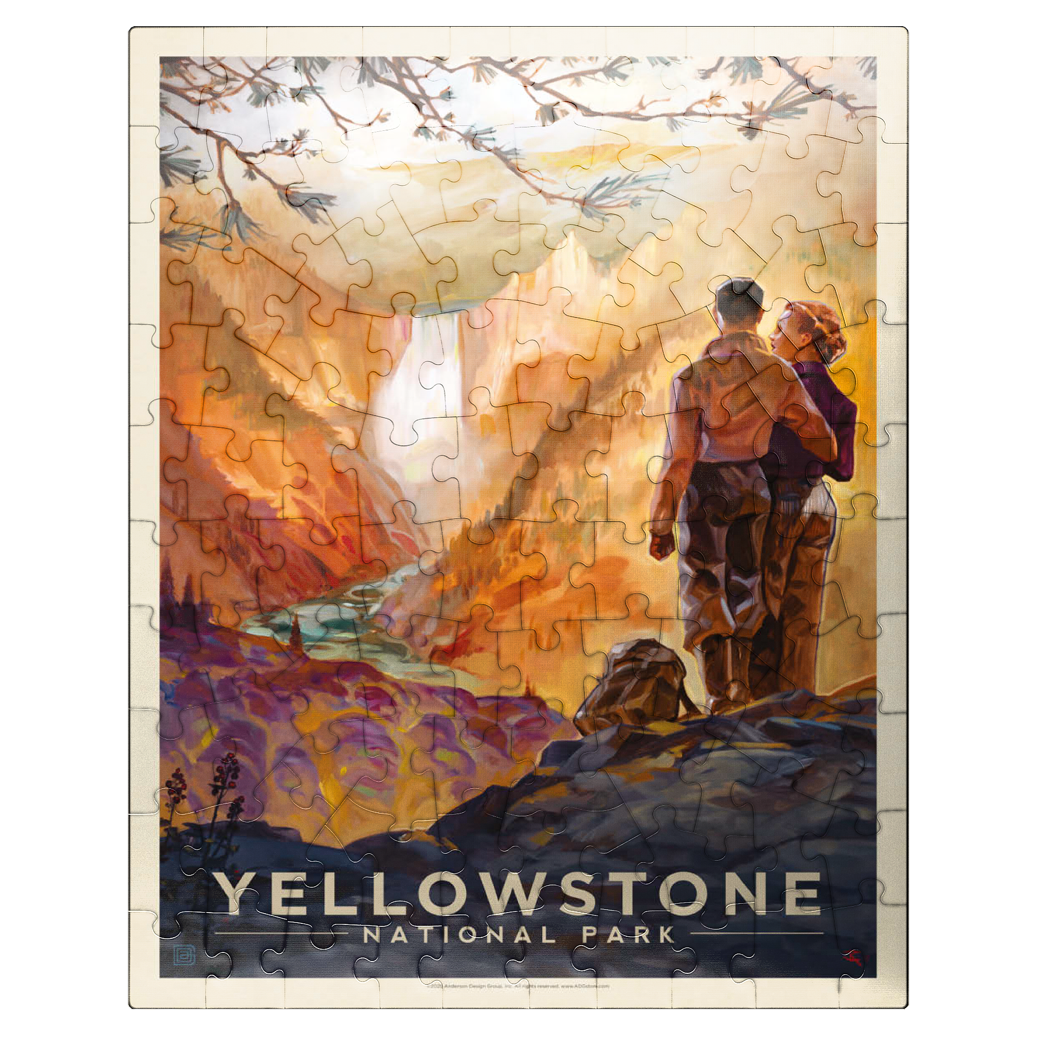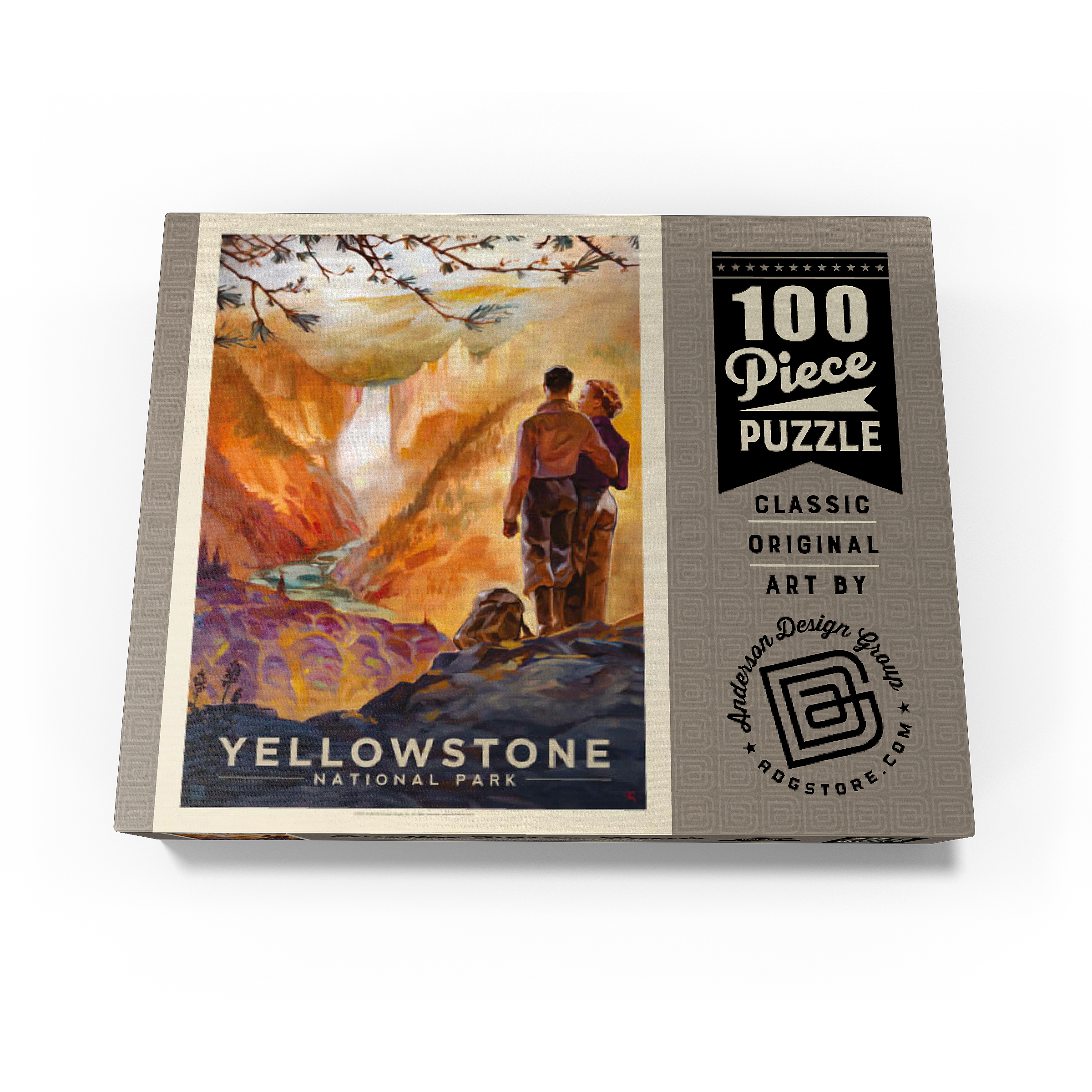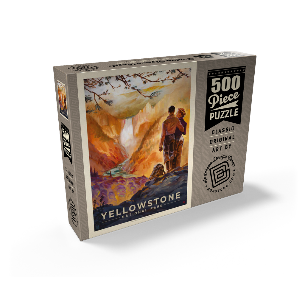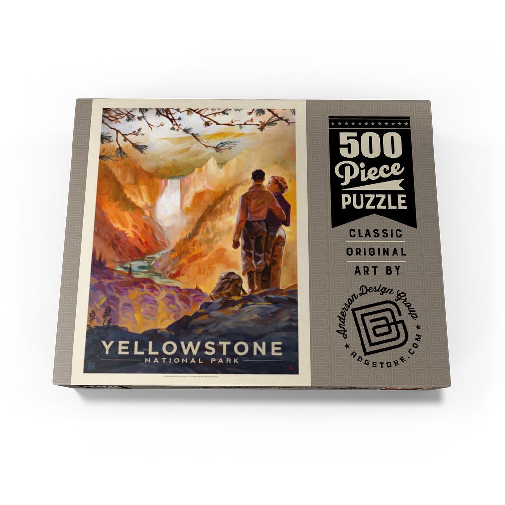 Yellowstone National Park in Wyoming is highlighted in this vivid artistic scene, showcasing the dramatic Lower Falls of the Yellowstone River within the Grand Canyon of Yellowstone. A couple stands at the overlook, gazing across the colorful canyon walls painted in gold, red, and violet hues as the powerful waterfall cascades into the winding river below. This depiction emphasizes the park's breathtaking geology, expansive vistas, and romantic sense of adventure. Established in 1872 as America's first national park, Yellowstone remains world-famous for its waterfalls, geothermal wonders, and diverse wildlife, making it one of the most iconic natural treasures in the United States.