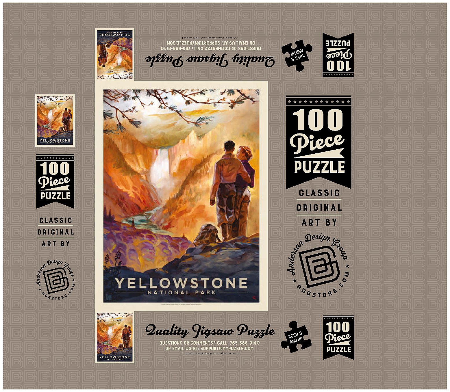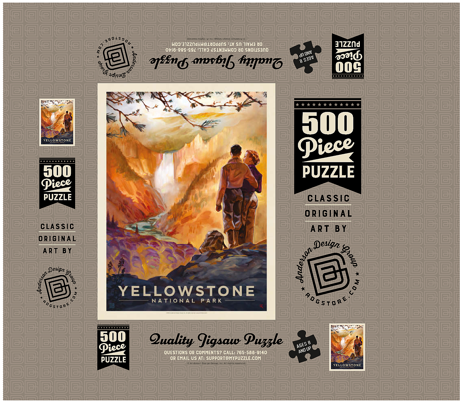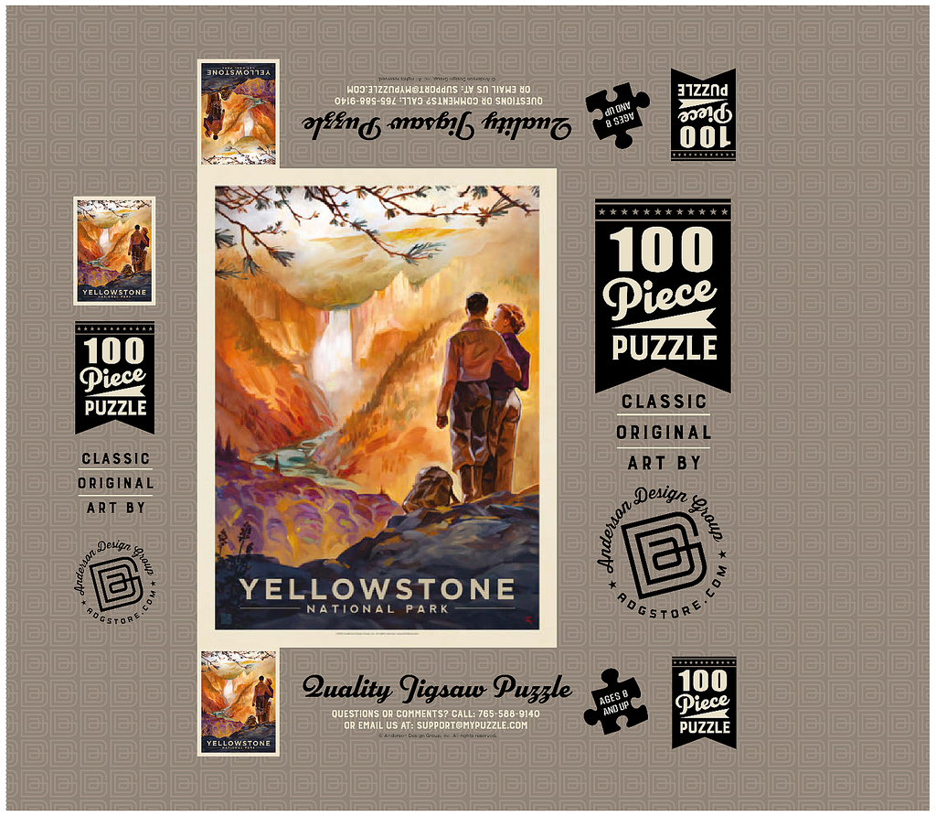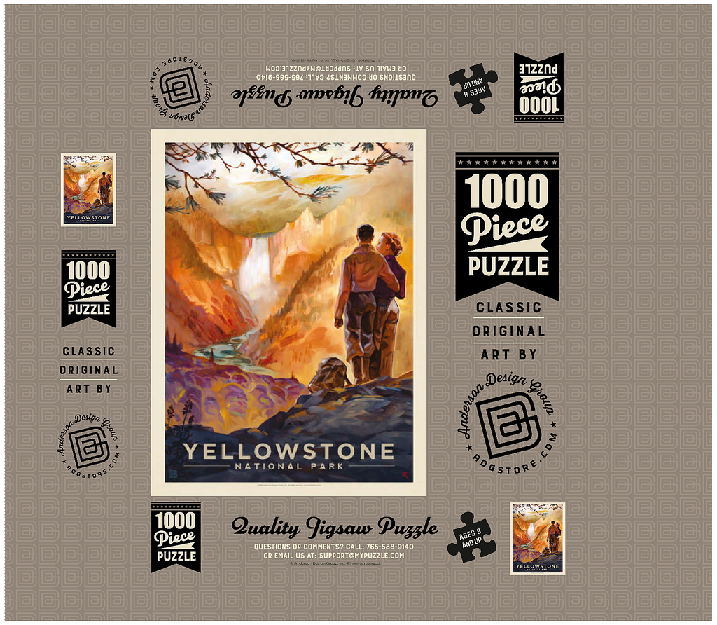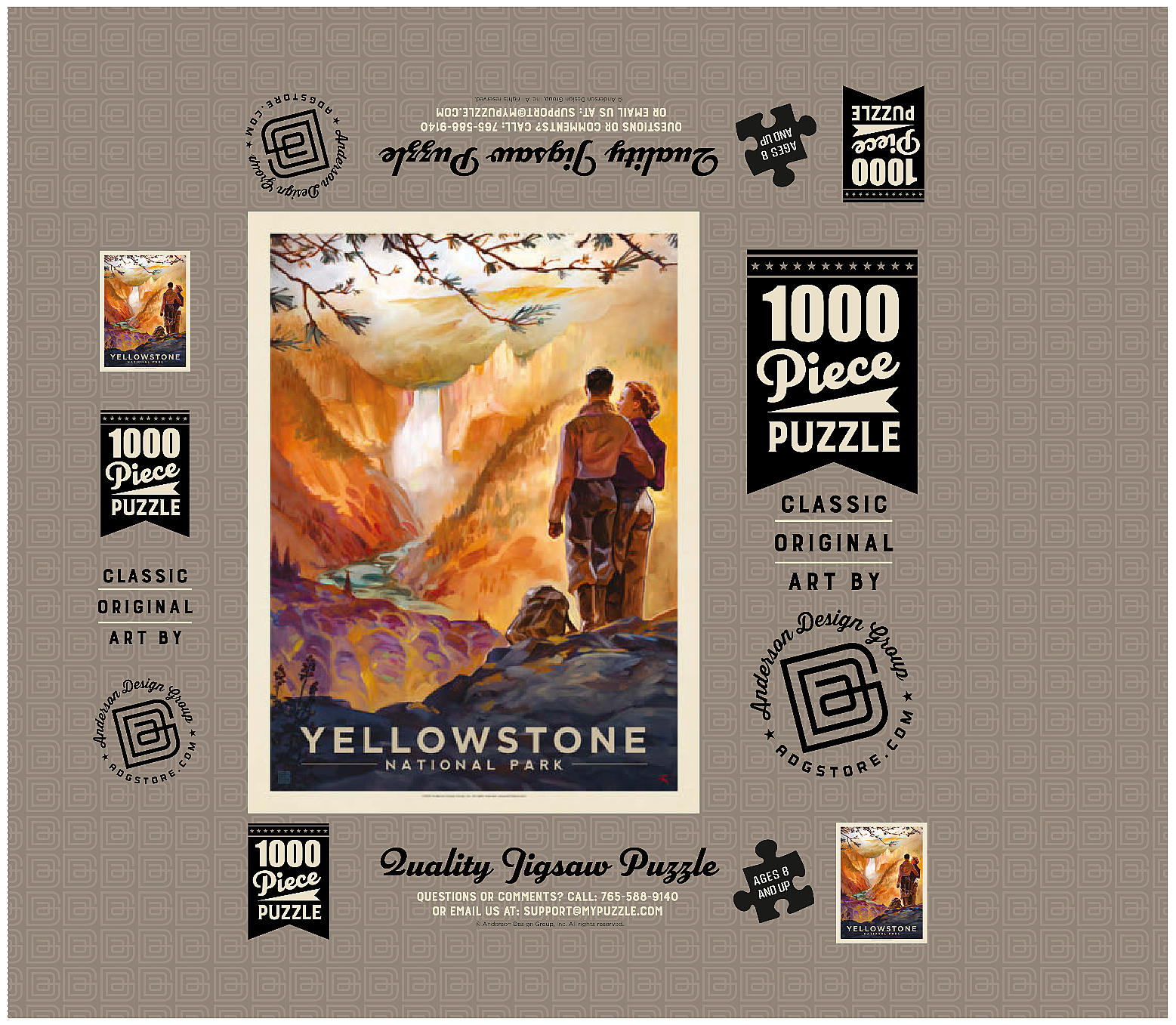 Yellowstone National Park in Wyoming is highlighted in this vivid artistic scene, showcasing the dramatic Lower Falls of the Yellowstone River within the Grand Canyon of Yellowstone. A couple stands at the overlook, gazing across the colorful canyon walls painted in gold, red, and violet hues as the powerful waterfall cascades into the winding river below. This depiction emphasizes the park's breathtaking geology, expansive vistas, and romantic sense of adventure. Established in 1872 as America's first national park, Yellowstone remains world-famous for its waterfalls, geothermal wonders, and diverse wildlife, making it one of the most iconic natural treasures in the United States.