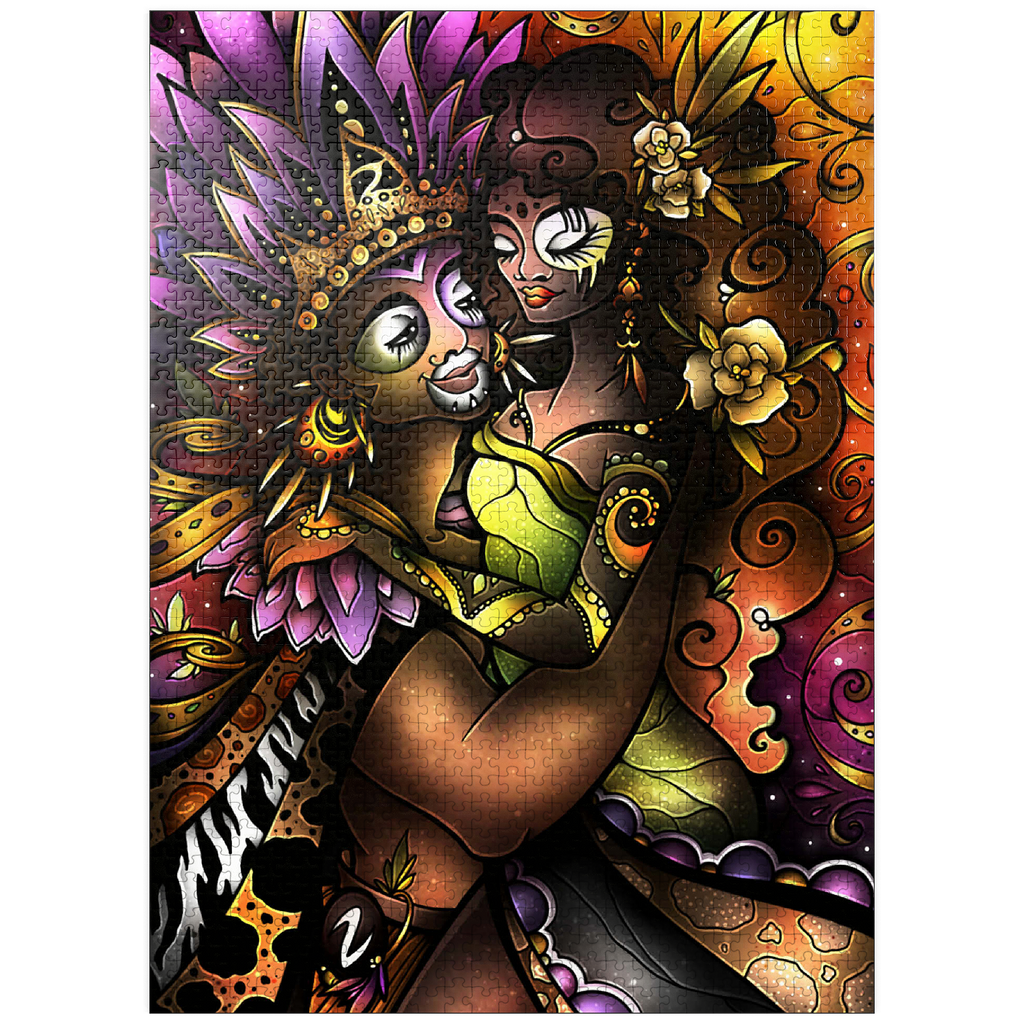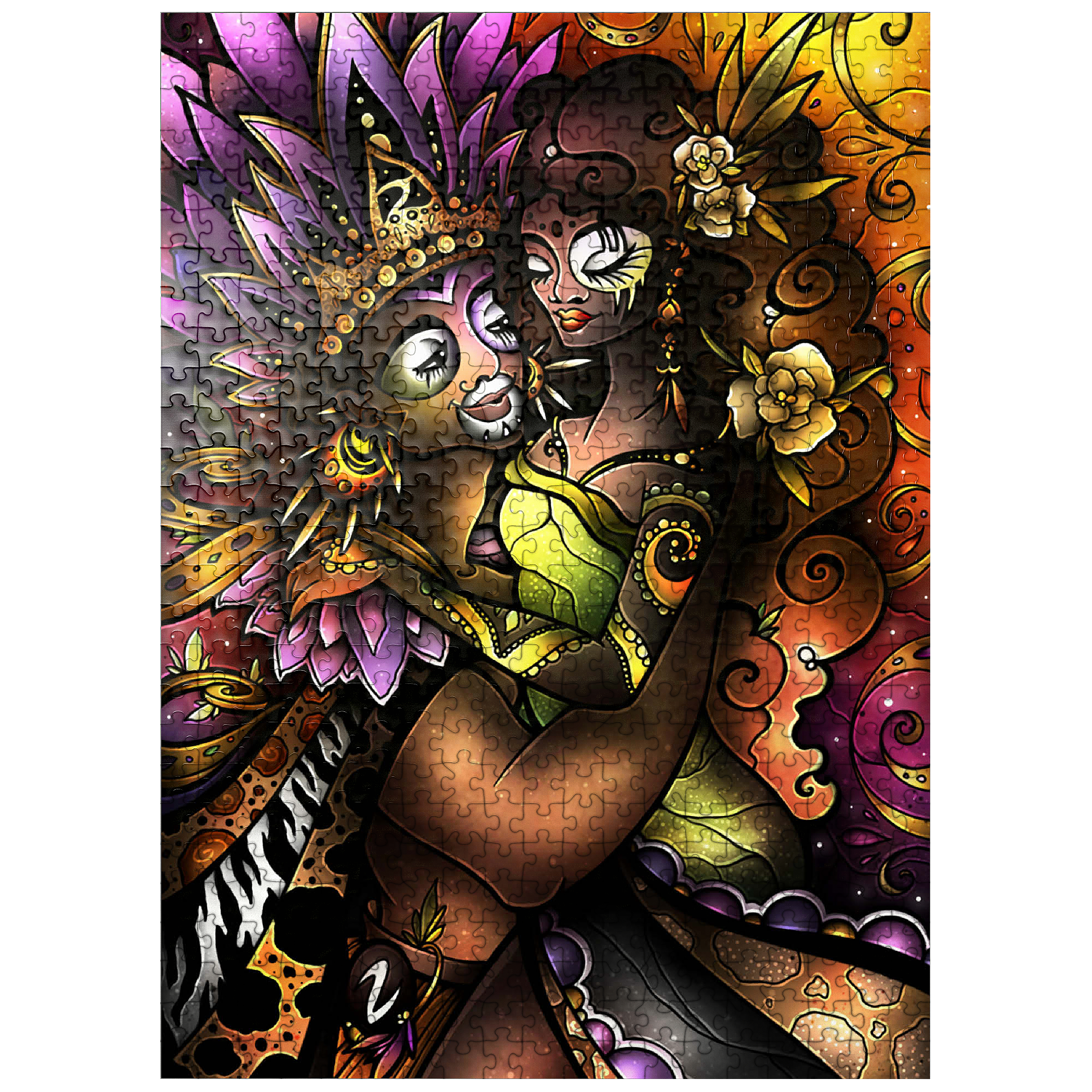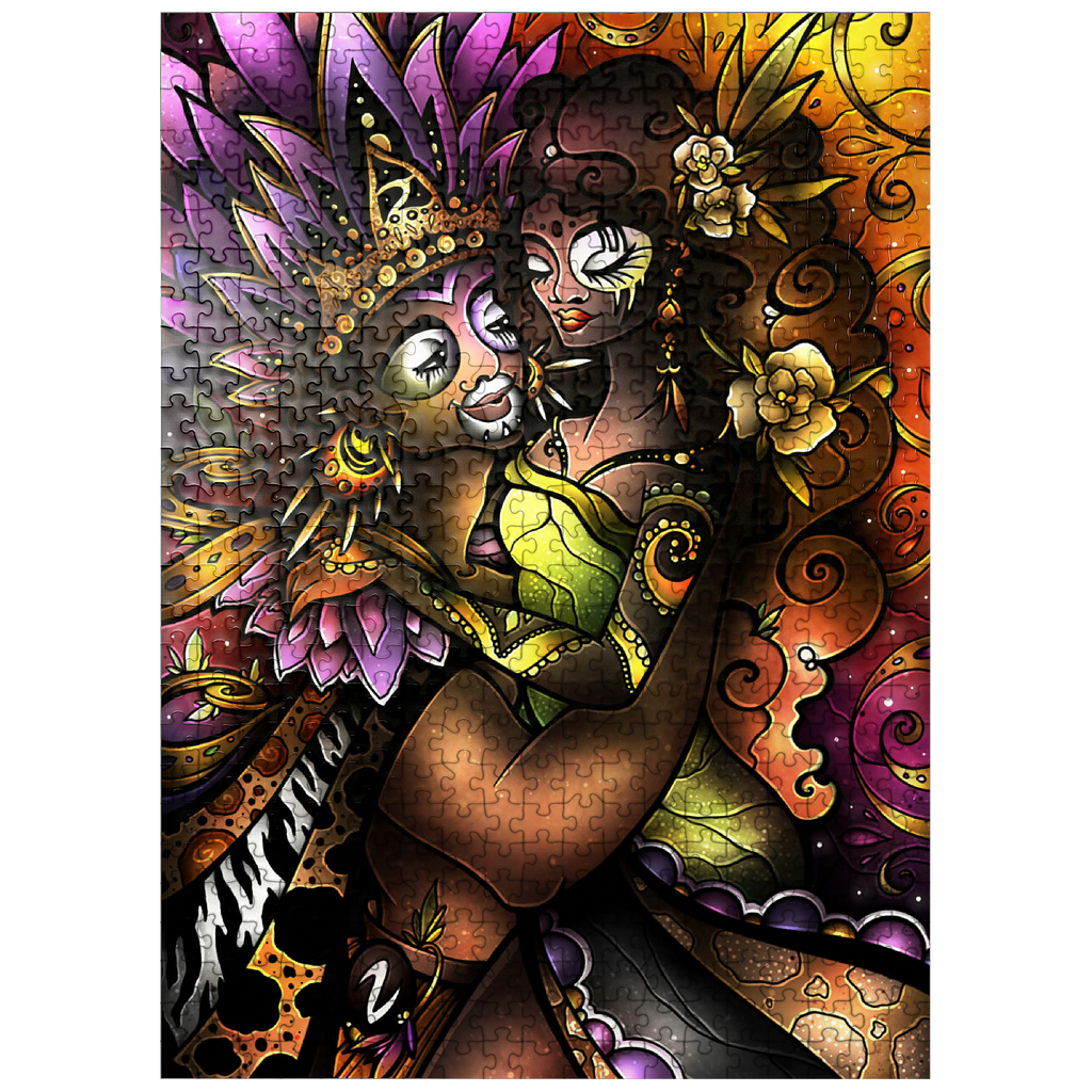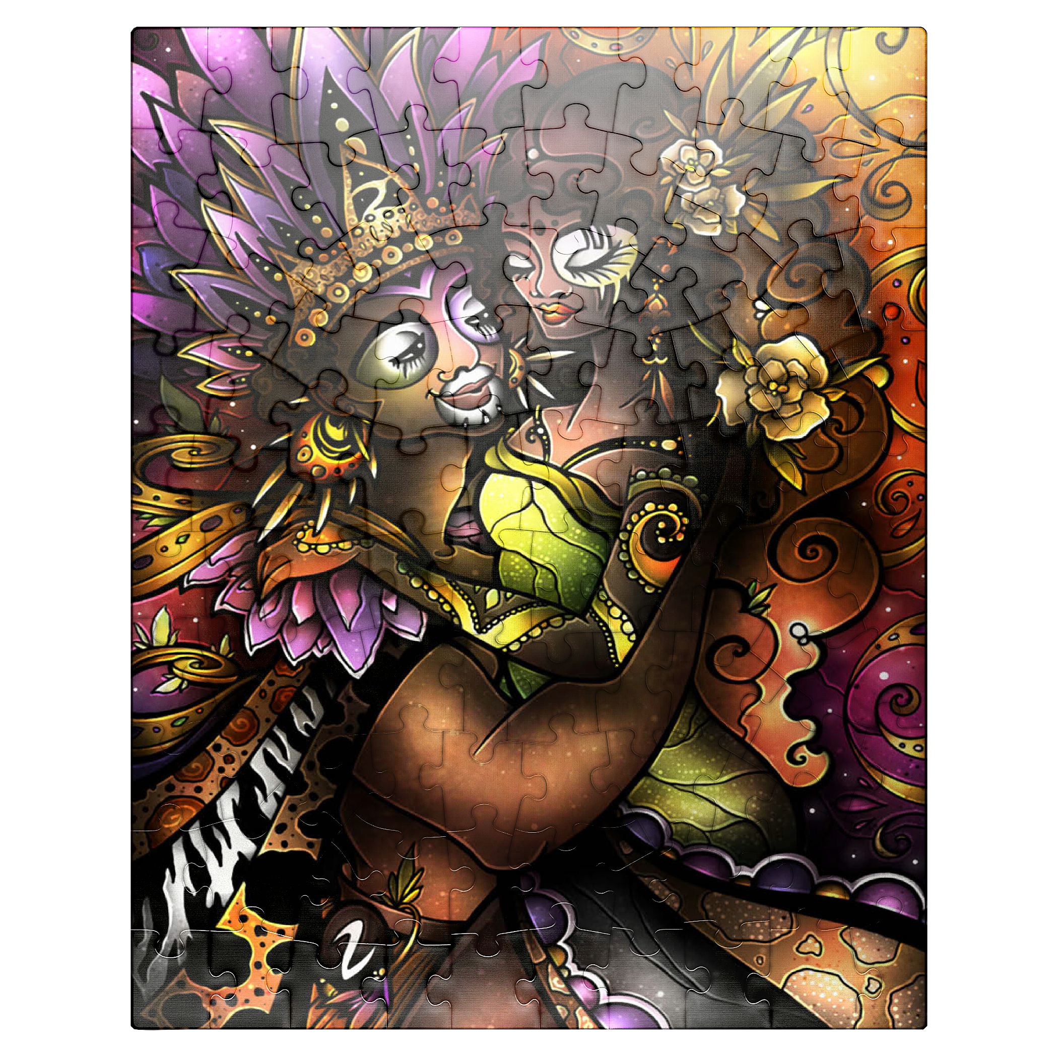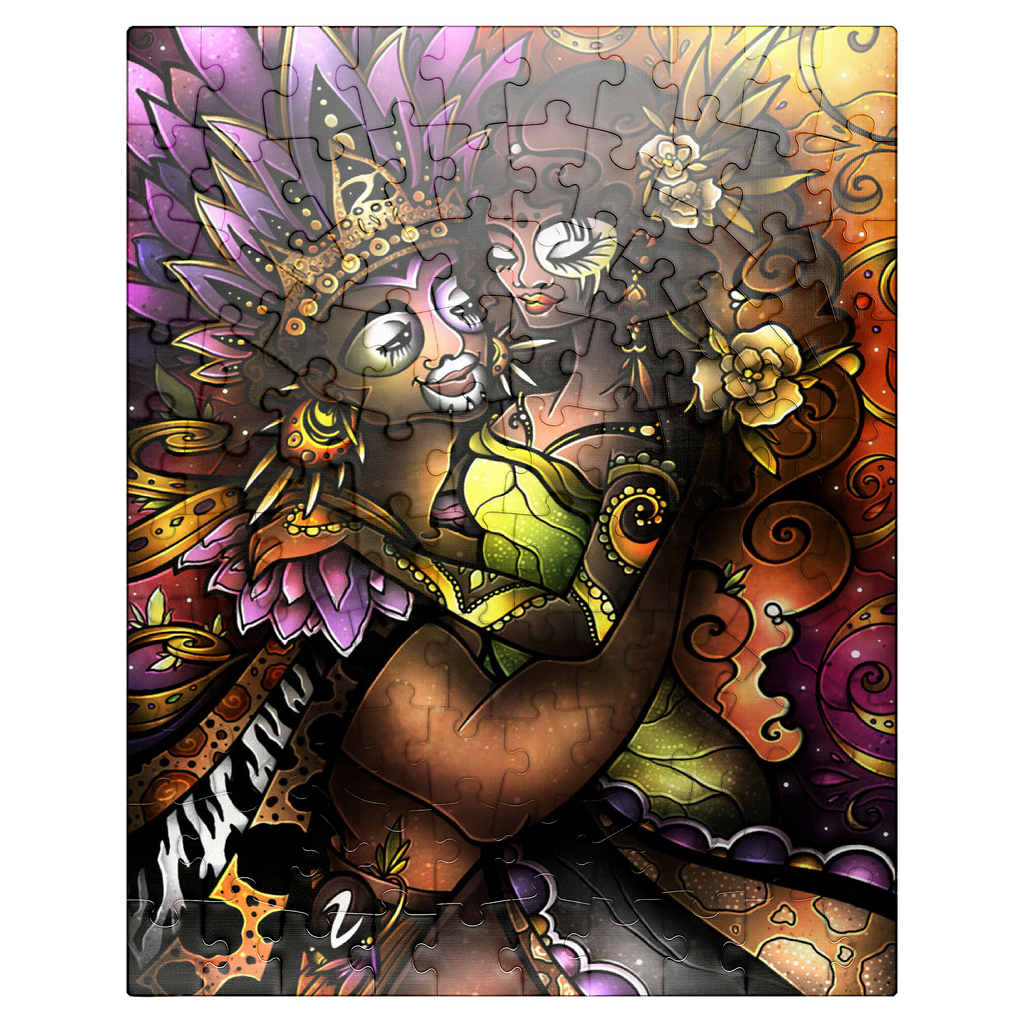 -This vibrant painting by artist Mandie Manzano features a King and Queen of the Krewe of Zulu, central to New Orleans' Mardi Gras. The artwork bursts with color, showcasing their elaborate costumes: a feathered headdress for the King and floral adornments for the Queen. Their faces, painted with traditional markings, show a tender gaze between them. The background swirls with intricate, colorful patterns, hinting at the festive energy of Mardi Gras. The puzzle promises a challenging and visually rich assembly.