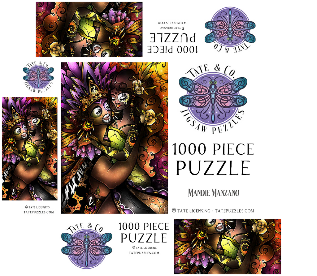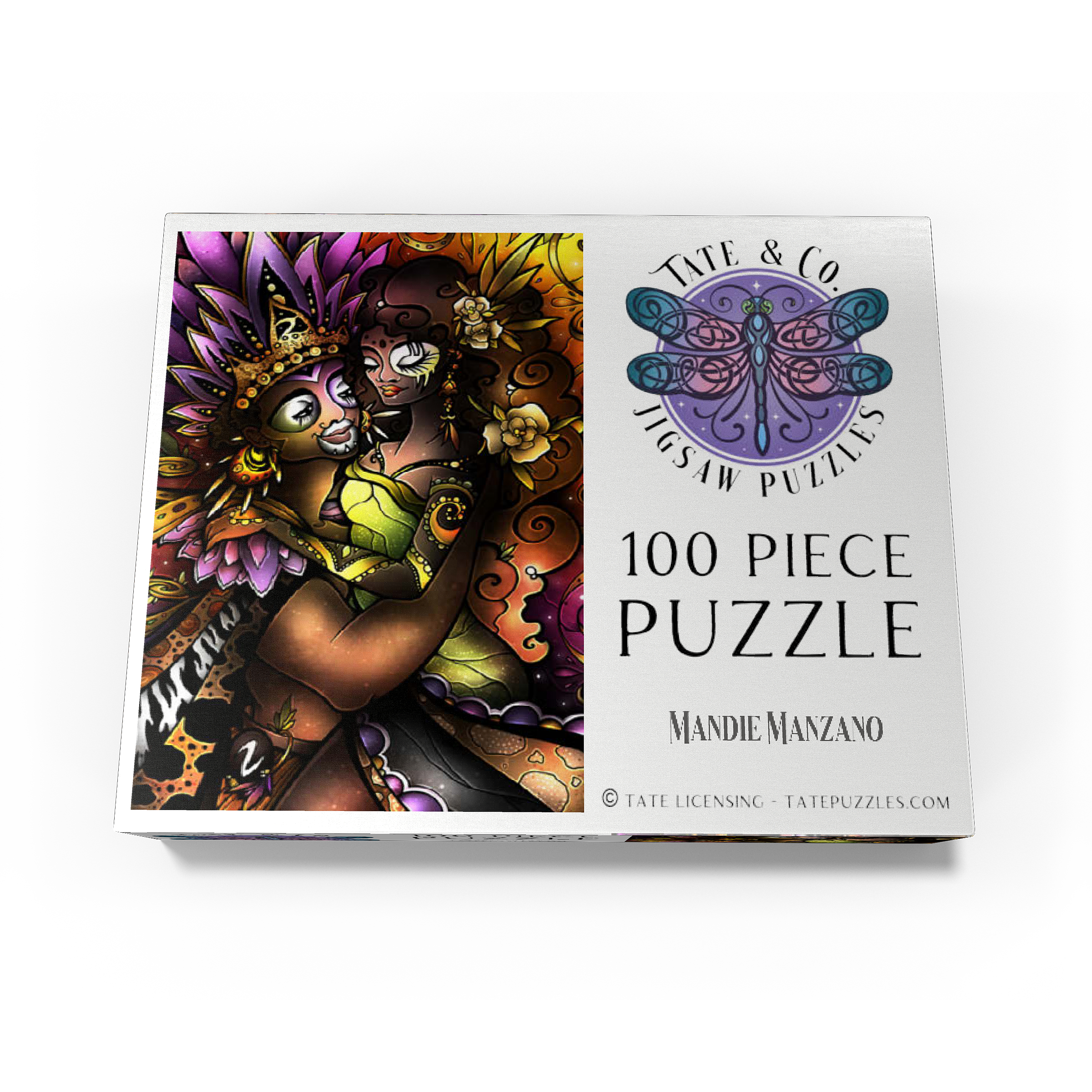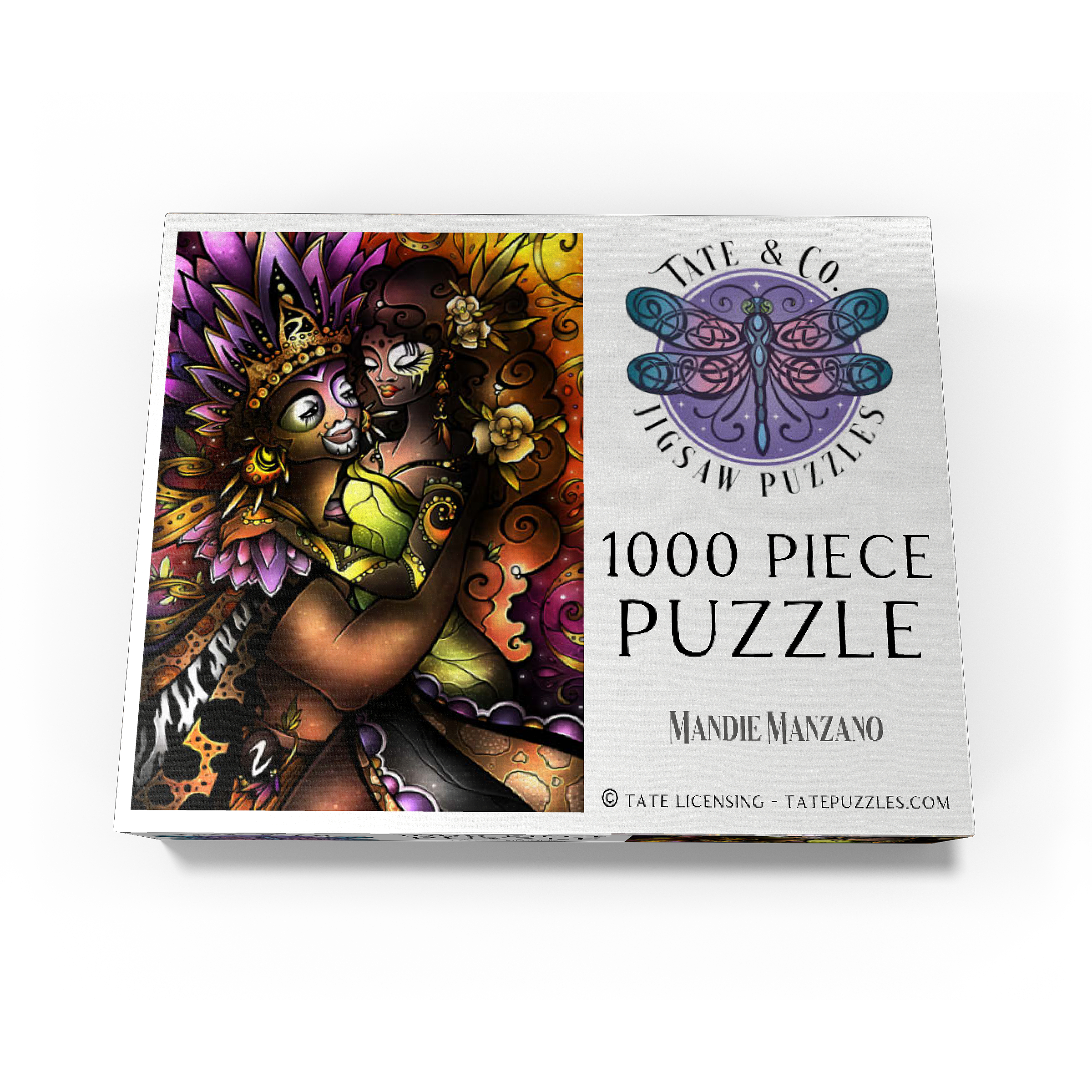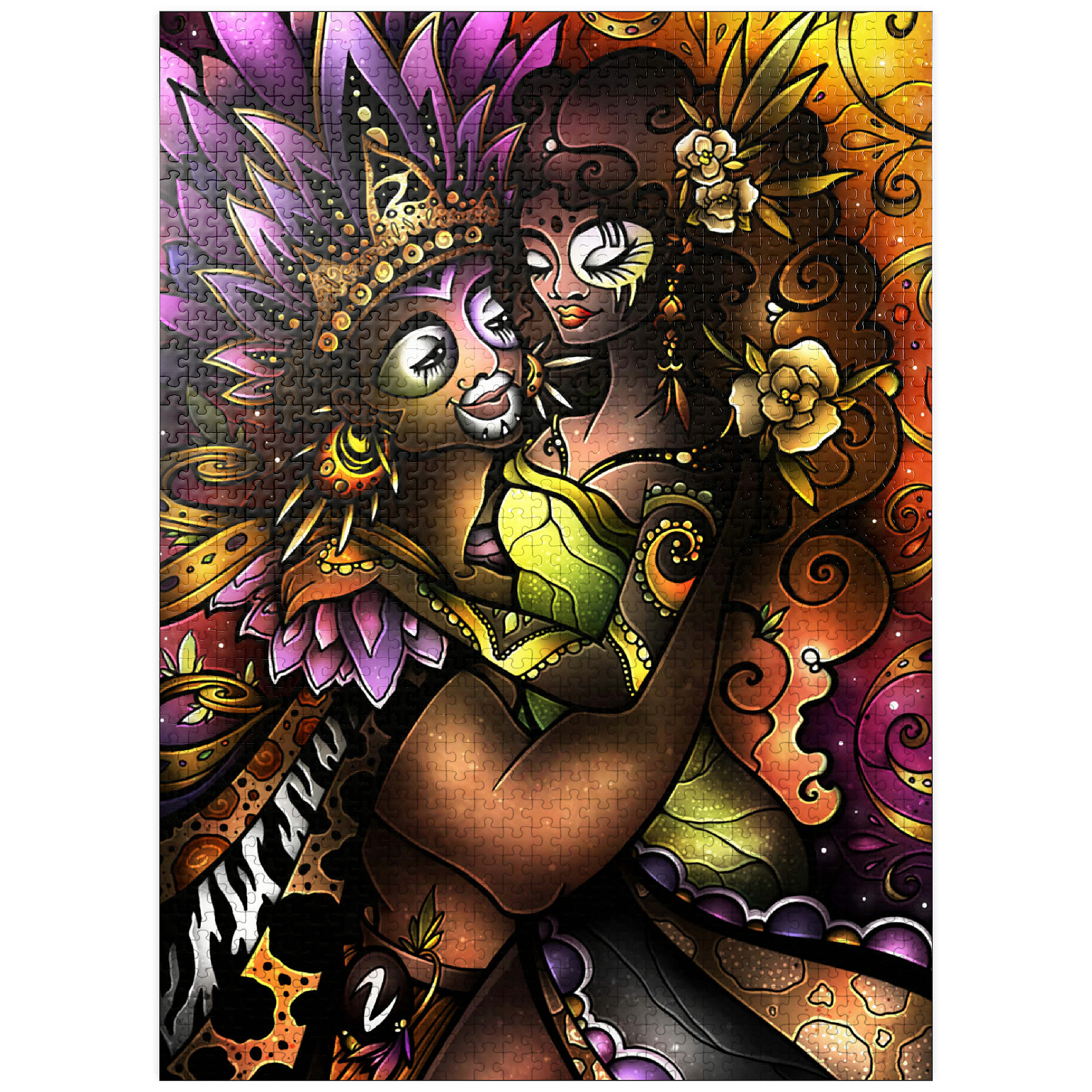 -This vibrant painting by artist Mandie Manzano features a King and Queen of the Krewe of Zulu, central to New Orleans' Mardi Gras. The artwork bursts with color, showcasing their elaborate costumes: a feathered headdress for the King and floral adornments for the Queen. Their faces, painted with traditional markings, show a tender gaze between them. The background swirls with intricate, colorful patterns, hinting at the festive energy of Mardi Gras. The puzzle promises a challenging and visually rich assembly.