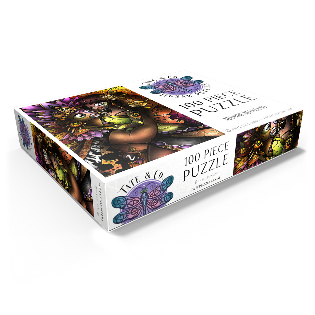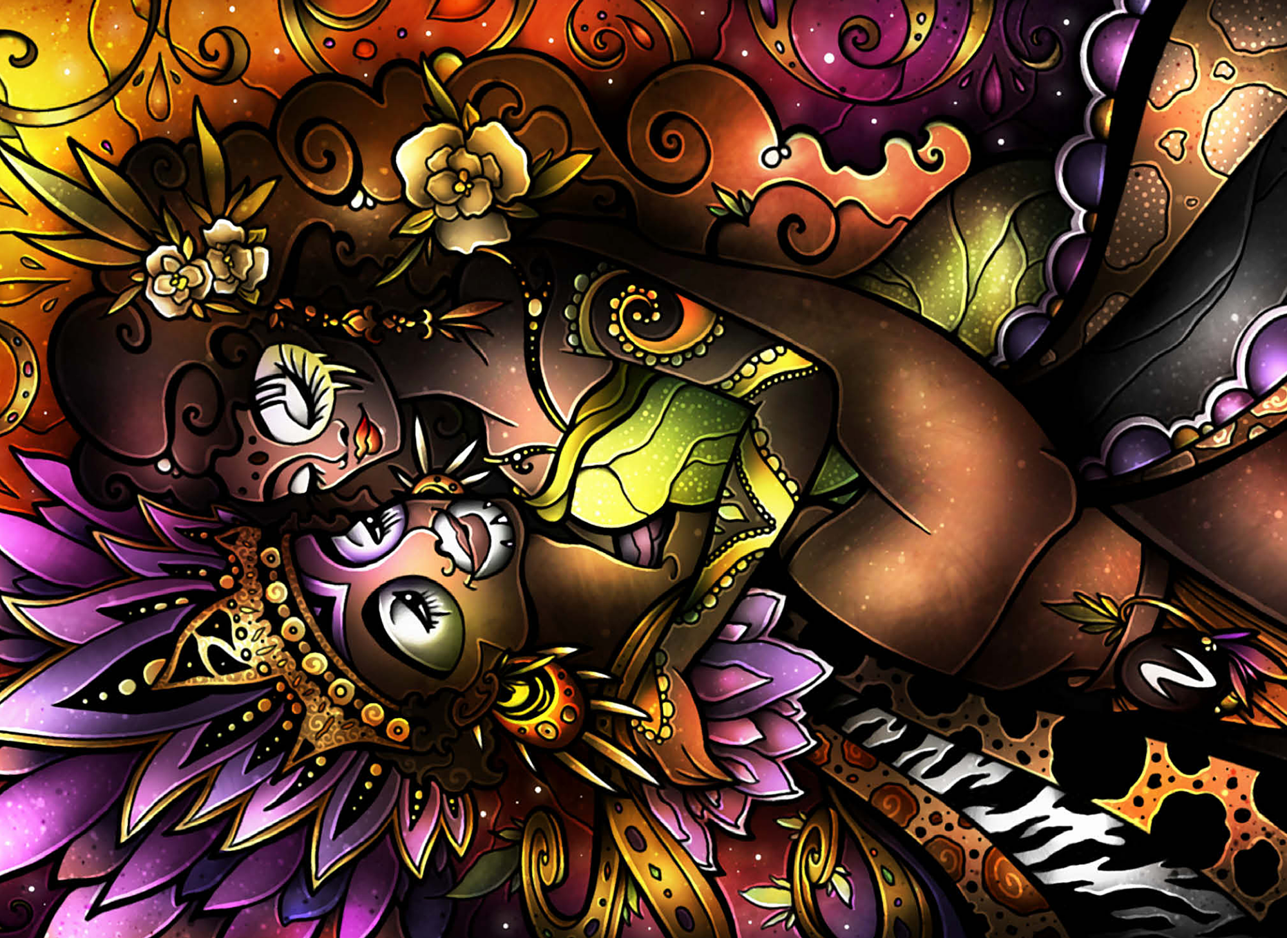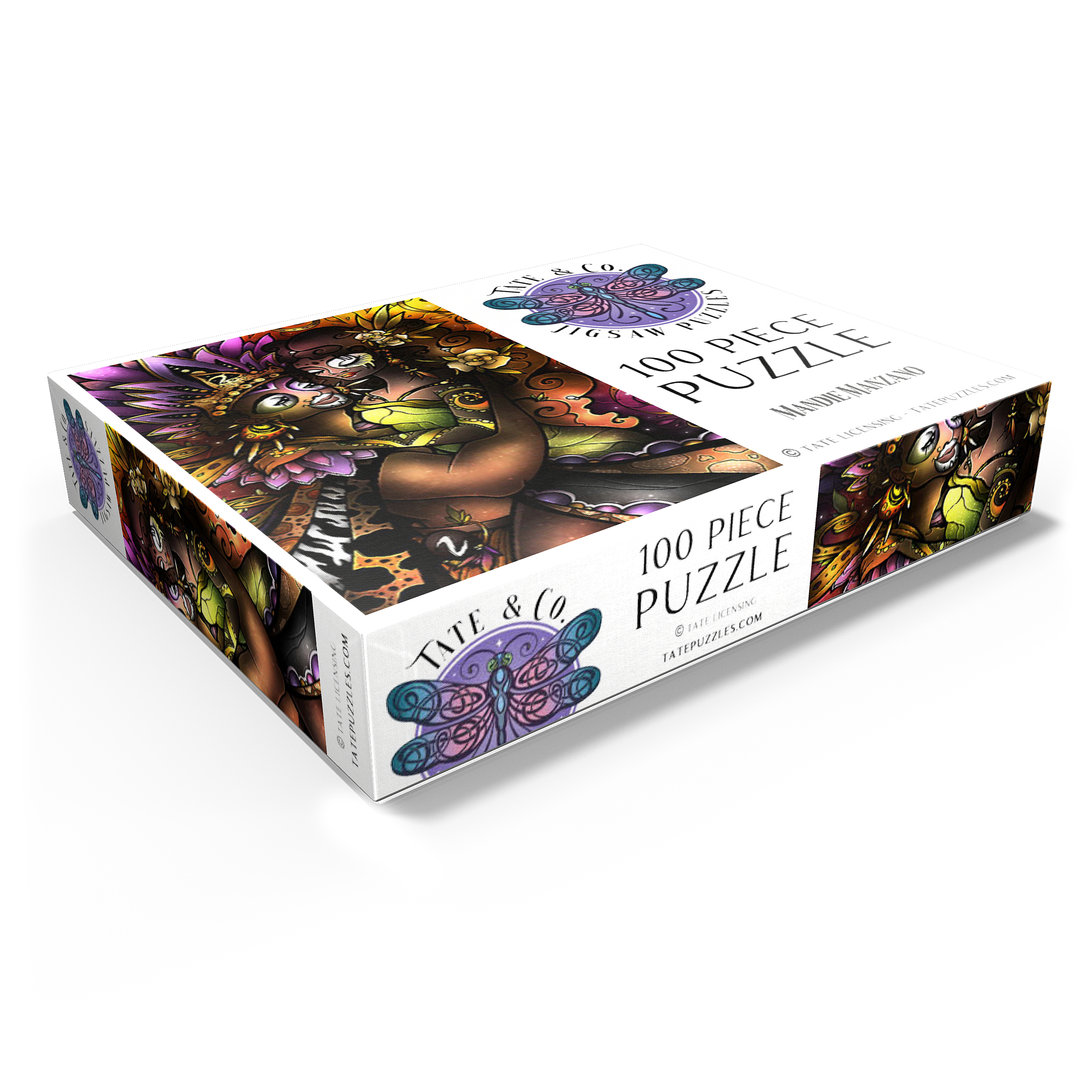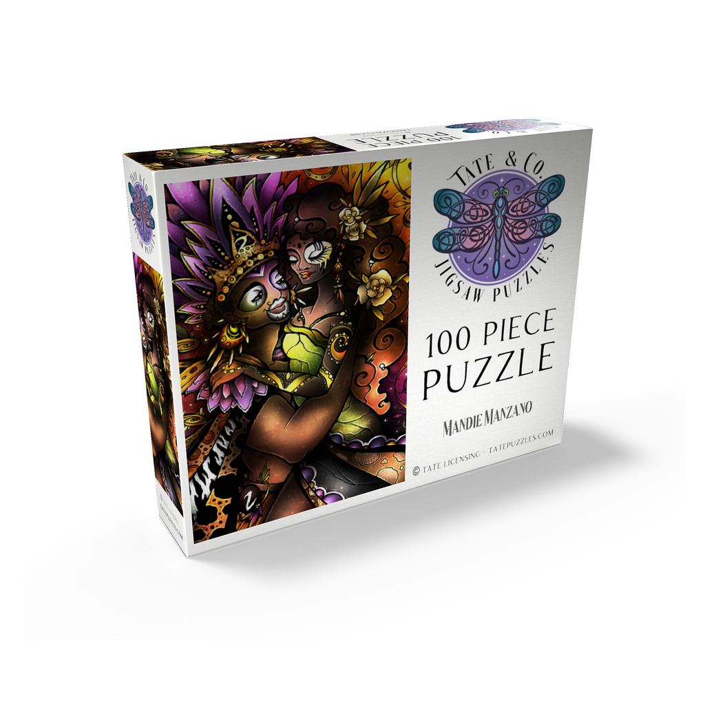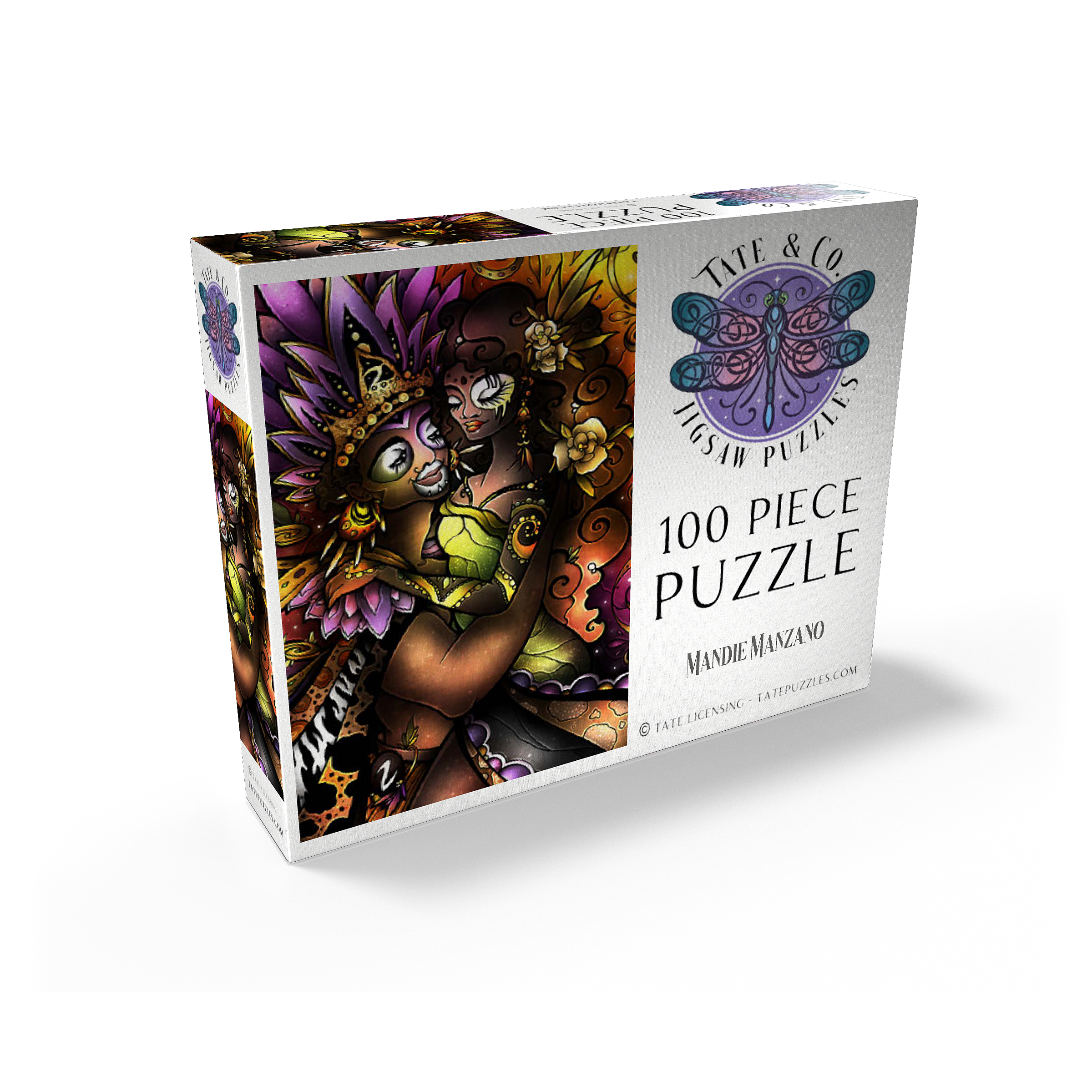 -This vibrant painting by artist Mandie Manzano features a King and Queen of the Krewe of Zulu, central to New Orleans' Mardi Gras. The artwork bursts with color, showcasing their elaborate costumes: a feathered headdress for the King and floral adornments for the Queen. Their faces, painted with traditional markings, show a tender gaze between them. The background swirls with intricate, colorful patterns, hinting at the festive energy of Mardi Gras. The puzzle promises a challenging and visually rich assembly.